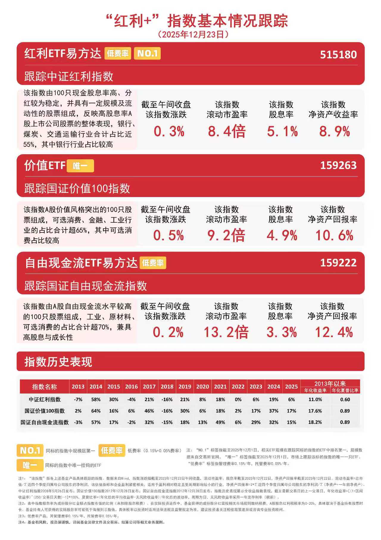 今日早盘,“红利+”指数震荡上行。截至午间收盘,国证价值100指数上涨0.5%,中证红利指数上涨0.3%,国证自由现金流指数上涨0.2%。相关ETF中,价值ETF(159263)此前连续6个交易日获资金净流入,合计约1.5亿元。 国证价值100指数采用“高分红+高自由现金流+低市盈率”三维筛选体系,优选价值标的,历史表现稳健;国证自由现金流指数则采用自由现金流率进行选样,兼具高股息与成长性。价值ETF(159263)和自由现金流ETF易方达(159222)分别跟踪以上指数,可助力投资者把握相关风格投资机遇。