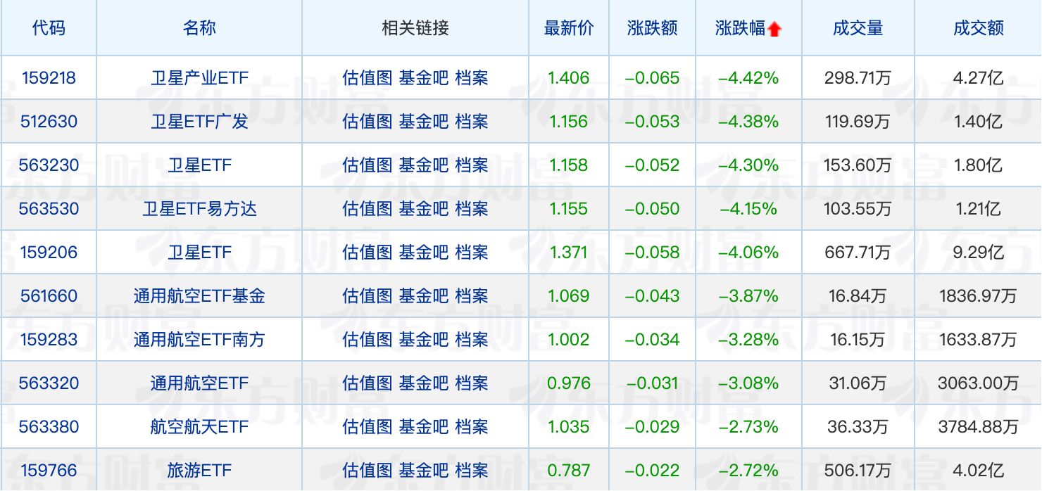 下跌方面,商业航天概念冲高回落,顺灏股份、航天机电跌停。卫星产业ETF回调,最大跌幅为4.42%。