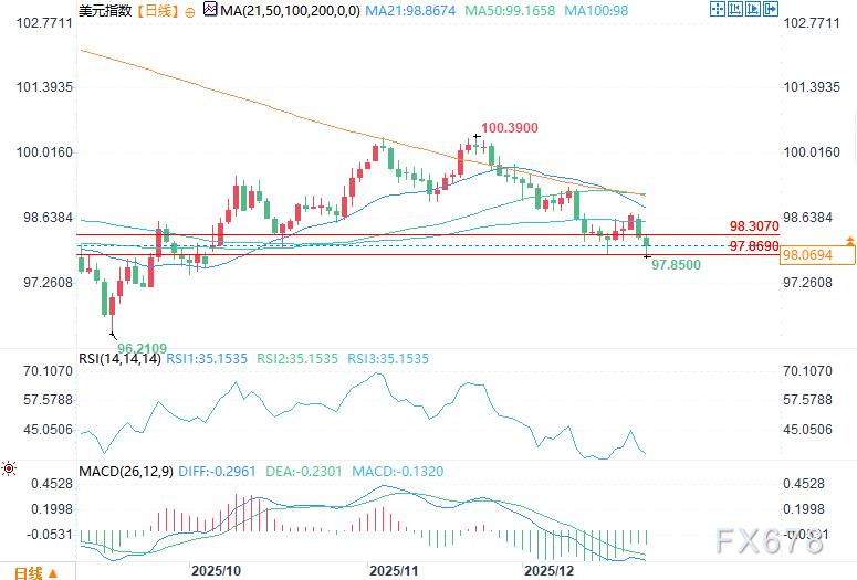 0周二(12月23日)美元指数走弱,但并未出现大幅崩盘。价格早盘下探至97.852,随后在节前交投清淡的市场中,于关键支撑位上方获得买盘支撑并反弹。市场流动性不均,价格反应被放大,交易员更倾向于择机入场,而非贸 ...