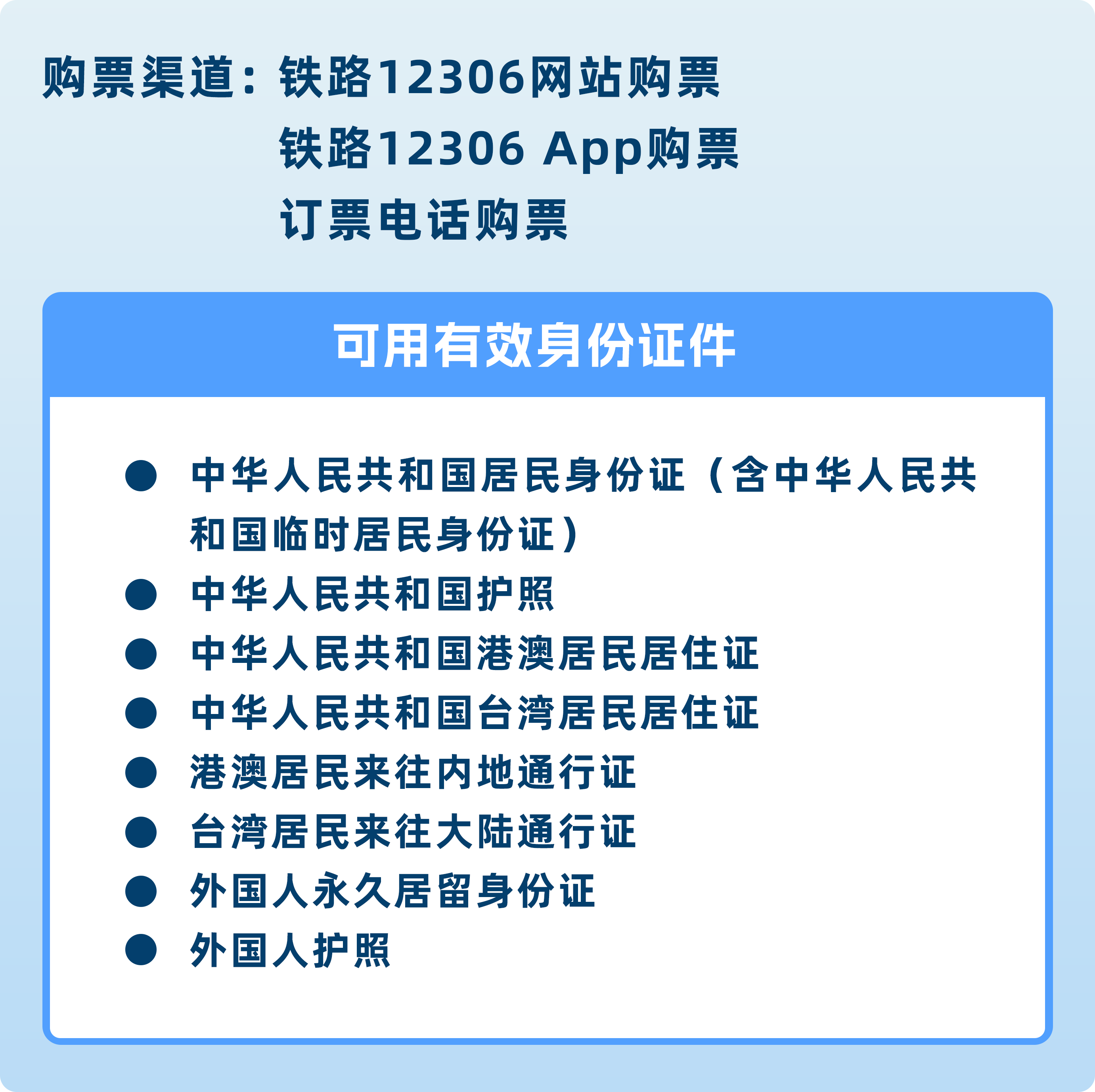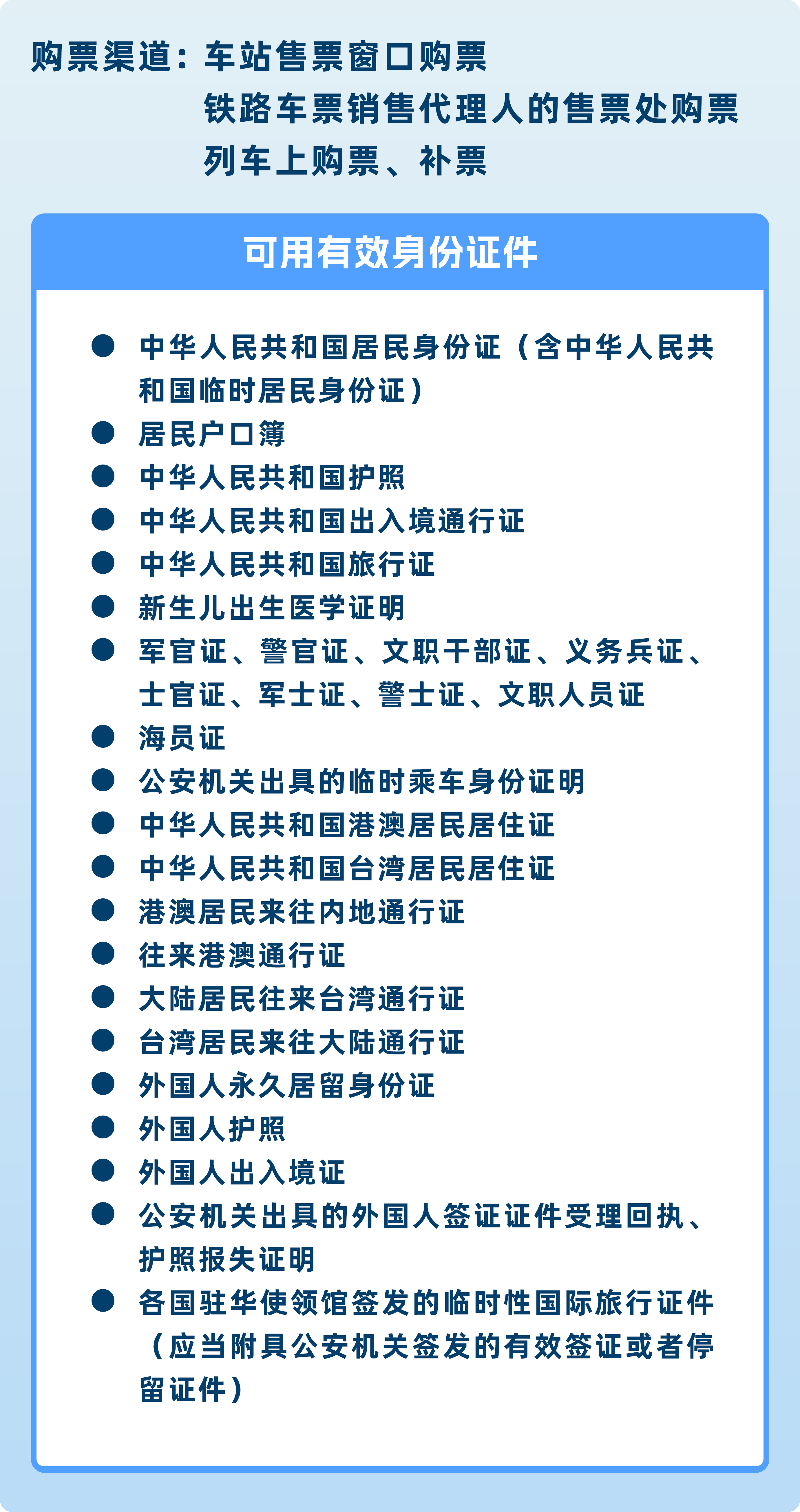 “在哪里买票?能用什么证件买?” “什么时间买?退票、改签要不要收费?” ...... 买火车票记牢这四点 “手把手”带你上车 购票可用身份证件 从不同渠道购票 可使用的有效身份证件也有所不同 买票时可别搞错了