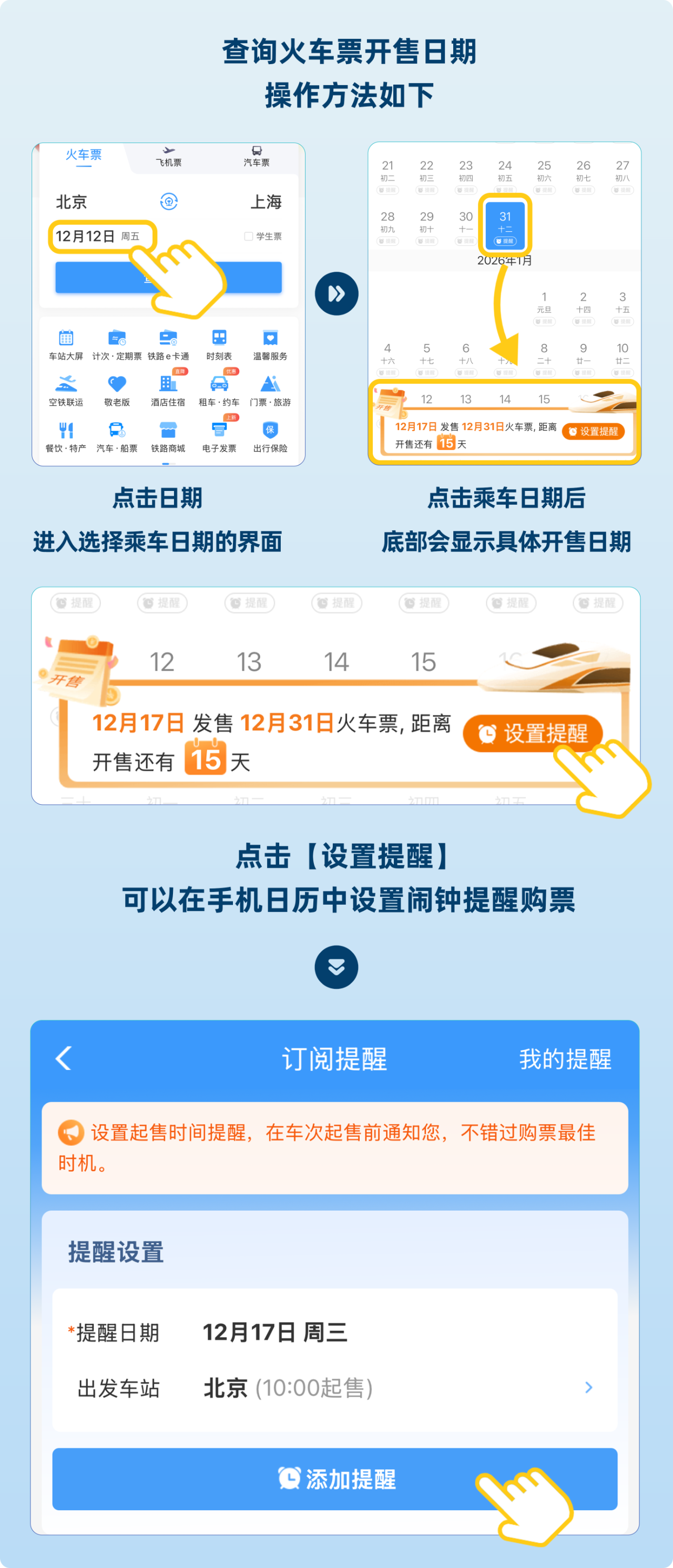 火车票开售时间查询 想知道车票哪天开售? 在铁路12306 App中就能快速查看 还能设置购票提醒哦