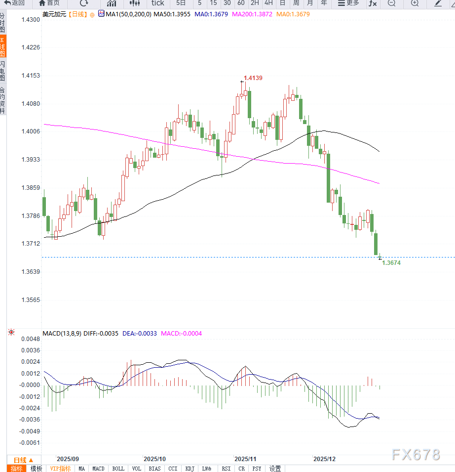 周三亚洲交易时段,美元兑加元(USD/CAD)连续第三日下行,最低触及1.3675,为近五个月以来的低位。整体走势显示,美元阶段性承压,而加元相对保持韧性,推动汇价重心持续下移。 ![]() 宏观数据方面,美国第三季度GDP年化增速达到4.3%,显著高于市场预期和前值,表面上显示经济动能强劲。 然而,部分分析认为,增长更多来自特定支出和库存变化,并未完全反映内生需求的真实强度。同时,美国核心PCE和GDP物价指数维持在相对高位,叠加消费者信心在12月走弱,使市场对经济前景的判断趋于谨慎。 在此背景下,美元的反弹动能受到抑制。强劲的GDP数据未能有效扭转美元走势,反而强化了“高增长难以持续”的担忧。 相比之下,加元表现相对稳健。加拿大方面,最新的初步GDP数据显示,11月经济环比增长0.1%,成功摆脱此前的收缩局面,缓解了短期经济下行压力。 与此同时,加拿大央行维持隔夜利率在2.25%不变,并释放出更偏向“数据依赖”的观望信号,而非继续降息,这使得加元在利差层面获得一定支撑。 从日线结构来看,美元兑加元(USD/CAD)已进入明显的下行通道。汇价连续多日收阴,并有效跌破前期重要支撑位1.3750,下探至1.3675一线,刷新阶段新低,显示空头力量占据主导。 均线系统方面,5日、10日及20日均线呈空头排列并同步向下运行,对汇价形成反压;价格运行在中短期均线下方,趋势性偏空格局明确。 动能指标上,RSI已回落至40附近,尚未进入严重超卖区间,表明下行空间仍未完全释放;MACD位于零轴下方且绿柱持续放大,空头动能仍在增强。 整体来看,USD/CAD日线处于趋势性下跌延续阶段,若短期无法重新站回1.3750上方,汇价不排除进一步下探1.3600附近支撑的可能。 ![]() 综合来看,USD/CAD的下行更多反映了美元预期走弱与加元政策稳定之间的相对变化。在美联储降息预期持续发酵、而加拿大央行保持谨慎立场的情况下,汇价短期内仍偏向震荡下行。 若后续美国就业与消费数据继续走软,而加拿大经济保持温和修复,USD/CAD不排除进一步测试下方支撑区间的可能。
