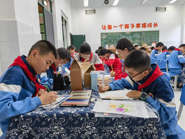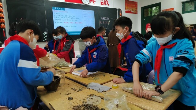 而在另外一间教室,几十个孩子正在老师指导下分组合作,有的在做艾条,有的在用檀香做香牌,大家敲敲打打、揉揉搓搓,好不热闹。 “让孩子们通过亲身实践,体验中医药文化的精髓,成为中医药文化的小小传承人,既能缓解心理焦虑情绪,也能拓宽孩子们的知识面,提升综合素养。”彭玉娜说。 走出教室,在文化长廊的LED多功能展示屏里,扫开任意一个作品的二维码,就出现了孩子讲解中药知识、故事的视频,他们从“被动听”到“主动讲”,文化自信在表达中扎根。这是学校依托“语言文字基地校”这个招牌,在中医药文化传播上做出的新文章。