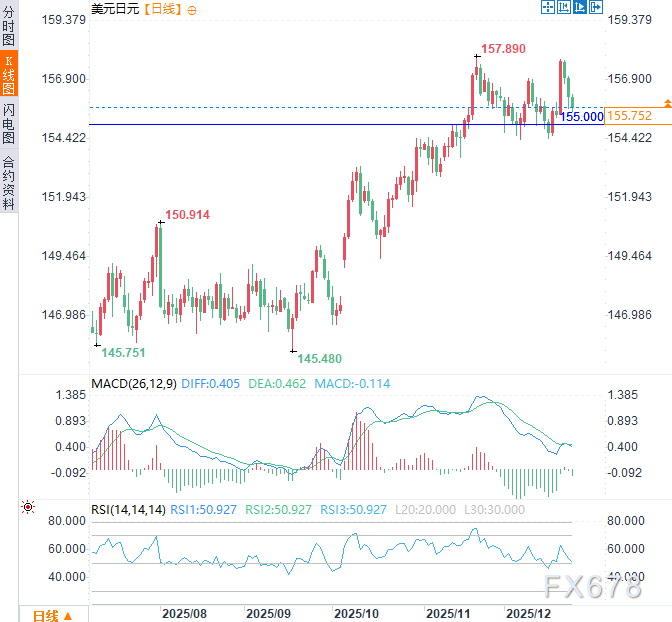 美元兑日元周三(12月24日)亚欧交易时段延续下行态势,连续第三个交易日走低,日内跌幅约0.30%,日本央行10月货币政策会议纪要显示,政策委员会成员就继续加息的必要性展开辩论。此外,地缘政治不确定性——包括美国与委内瑞拉关系紧张加剧、俄乌冲突持续以及以色列与伊朗冲突再起的风险——增强了日元的避险吸引力。 ![]() 然而,市场乐观情绪对日元构成阻力,并帮助美元兑日元在155.50中段附近获得支撑。尽管如此,基本面对日元多头有利,市场需对美元/日元任何实质性反弹保持谨慎。 日元延续涨势,受日本央行加息预期与避险需求提振 日本央行于本周三稍早公布的10月货币政策会议纪要显示,政策委员会成员一致同意,若经济及物价展望符合预期,日本央行将继续加息。在随后的12月会议上,日本央行将政策利率上调至0.75%,创下30年新高。 此外,美国对委内瑞拉油轮采取行动引发的地缘紧张局势,俄乌冲突升级,以及可能爆发的新的以色列-伊朗冲突,连续第三天支撑了避险货币日元。除此之外,普遍的美元抛售倾向进一步促使美元/日元承压。 美元指数周三一度跌至10月初以来的新低(97.75),原因在于市场对美联储在2026年将进一步降息两次的预期升温。加之,美国总统唐纳德·特朗普宣称,美联储主席的候选人必须承诺即使在经济表现良好时也会降息。市场对美联储独立性的担忧也对美元信用产生动摇,进而构成下行压力。 这令周二公布的乐观美国GDP增长数据黯然失色。数据显示,第三季度美国经济年化增长率为4.3%,这一读数强于市场普遍预期,也高于上一季度3.8%的增幅,但并未能为美元多头提供喘息之机,也未能帮助缓解普遍的抛售压力。 另外,美国人口普查局报告称,10月耐用品订单环比下降2.2%,前值为增长0.7%,且降幅大于市场预期的1.5%。此外,12月消费者信心指数大幅下滑,表明家庭对未来的态度正变得更为谨慎。 交易员目前正关注将在周三晚间公布的美国上周初请失业金人数数据,该数据可能影响美元走势,进而影响美元/日元动力。然而,市场焦点仍将牢牢锁定在周五公布的东京CPI报告于日本11月失业率上,这些数据可能在短期内对日元需求产生关键影响。 美元兑日元看跌的技术形态为进一步贬值提供了支撑 美元兑日元现已逆转了日本央行决策后的大幅上涨,回撤至155.70附近位置。此外,始于157.89关口附近的周线下跌趋势构成了看跌双顶形态,并进一步确认了汇价的看跌前景。 与此同时,移动平均收敛发散指标(MACD)线略低于零轴,而负向柱状图的轻微加深暗示着看跌动能正在积聚。相对强弱指数(RSI)从近期高点回落后,目前位于50(中性)水平,强化了市场的观望立场。 这表明,美元兑日元的下行可能在155.00心理关口附近获得支撑。紧随其后的是154.55-154.50水平区域,该区域料将构成看跌形态的颈线支撑。若汇价有效跌破该区域,将被视为空头交易的关键触发点,或为进一步的深度下跌铺平道路。 ![]() 北京时间14:33,美元兑日元交投于155.72/73。