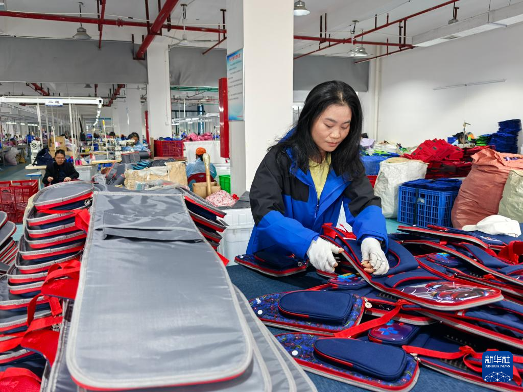 龙升社区居民陈方林在麻阳森佳箱包有限公司工作。新华社记者程济安 摄