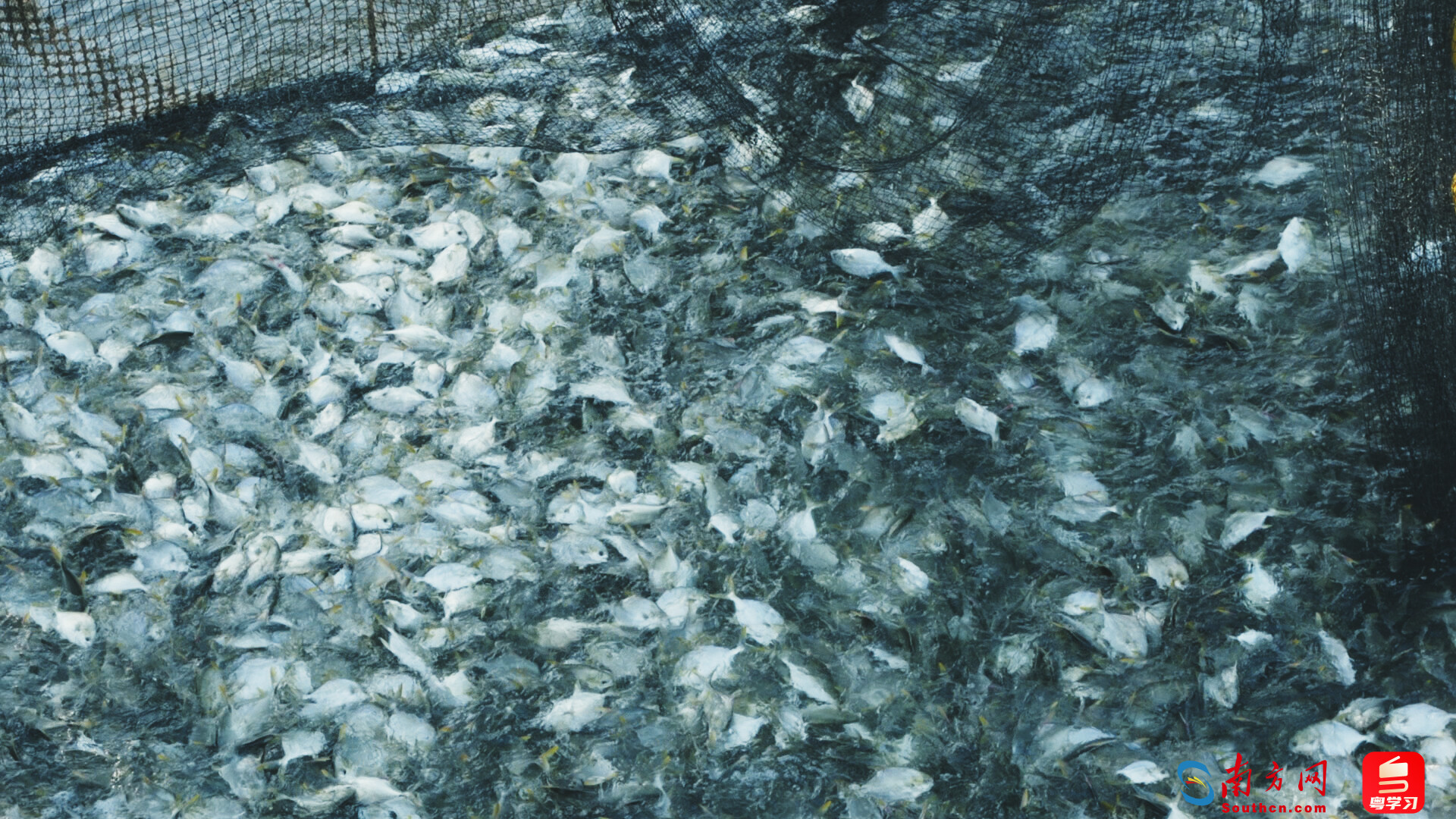 “海威2号”。 海上阳光炽烈,滚烫的甲板反射着白光。“保养平台就是日常工作。”这位退伍军人手法娴熟地刷漆,“阳光曝晒以及海水腐蚀,你看很多地方生锈了,不保养可不行。” 广东海威农业集团副总经理、广东海威海洋牧场总经理欧阳传新向记者介绍,“海威2号”由广东海威农业集团联合湛江湾实验室、中国科学院广州能源所共同研发,总造价三千多万元。 令人惊讶的是,这样一个年产值1800万元的大型养殖平台(按15元一斤金鲳鱼计算),日常管理仅需三人。欧阳传新介绍,“海威2号”实现了高度自动化:物资可一次性储存,免去二次转运;自动投料机精准投喂,缩短养殖周期;集中式大水体管理,大幅提高了作业效率。 在广东绵长的海岸线上,越来越多类似“海威2号”的现代化海洋牧场正在建设中。它们串联起高端装备制造、海洋生物医药、智慧渔业等产业链,正在形成一个规模庞大的新兴产业集群。 养鱼如养人 上午九点,黄建斌开始每日的第一次投喂。喂完饲料后,黄建斌没有急着离开,却盯着水面若有所思:“你看,饲料漂在水上,鱼不起来吃。”
