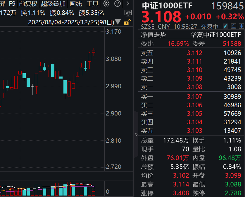 12月25日,A股三大指数走势分化,其中沪指上涨0.31%。截至10:51,中证1000ETF(159845)上涨0.32%。其他宽基指数中,上证50涨0.20%,沪深300跌0.12%,中证500涨0.22%。