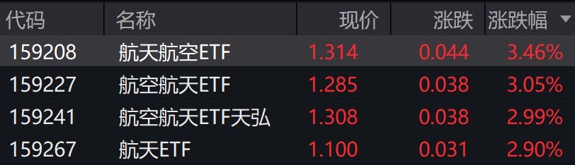 每经记者|叶峰 每经编辑|肖芮冬 航天航空概念股走强,航天电子、中国卫星、中航重机涨超6%,航发动力涨超4%。 受盘面影响,航天航空相关ETF涨约3%。