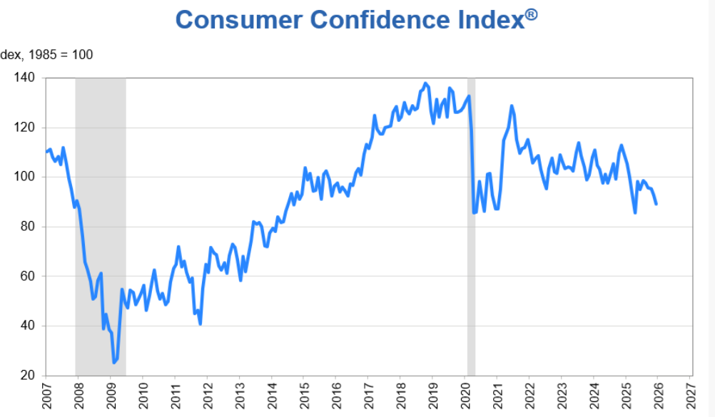 0美国研究机构世界大型企业研究会12月23日发布的初步调查数据显示,由于对商业环境看法负面,对就业和收入的担忧加剧,美国12月份消费者信心指数从11月份修订后的92.9进一步下滑至89.1,连续第五个月走低,为今年4月 ...