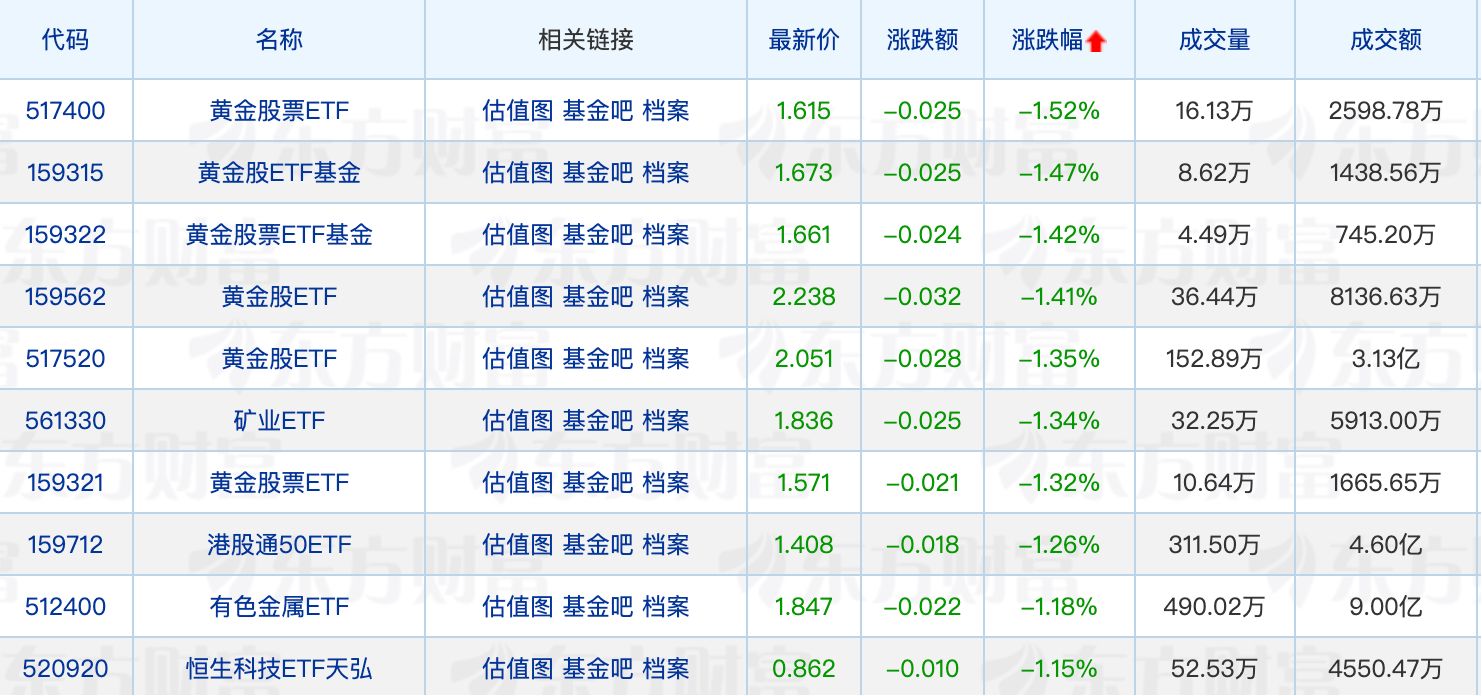 下跌方面,黄金股相关ETF跌幅居前。
