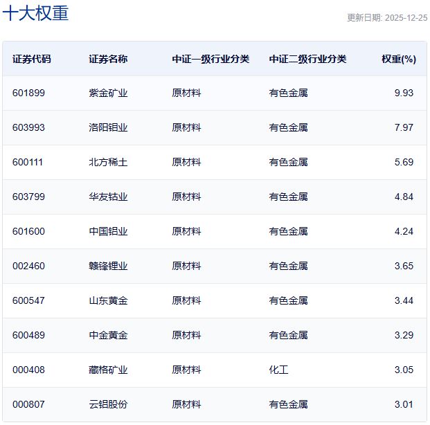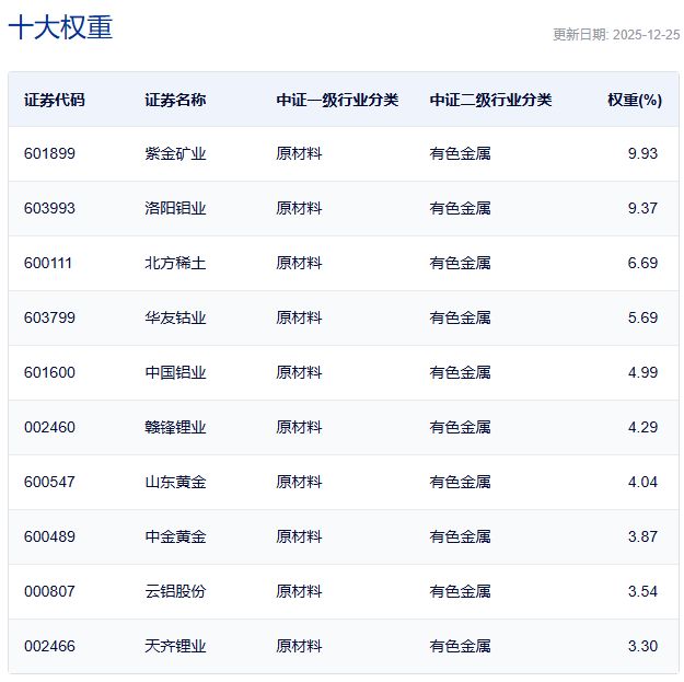 中证申万有色金属指数主要权重股 点评:有色金属ETF(159871)半日涨幅也达到3.12%,该ETF规模为24.64亿份,半日成交金额为7105.39万元,其追踪的是中证有色金属指数。追踪该指数的ETF还有有色龙头ETF(159876)和有色60ETF(159881),此两只ETF半日涨幅在3%左右。 中证有色金属指数选取涉及有色金属采选、有色金属冶炼与加工业务的上市公司作为样本,以反映有色金属类相关上市公司的整体表现。