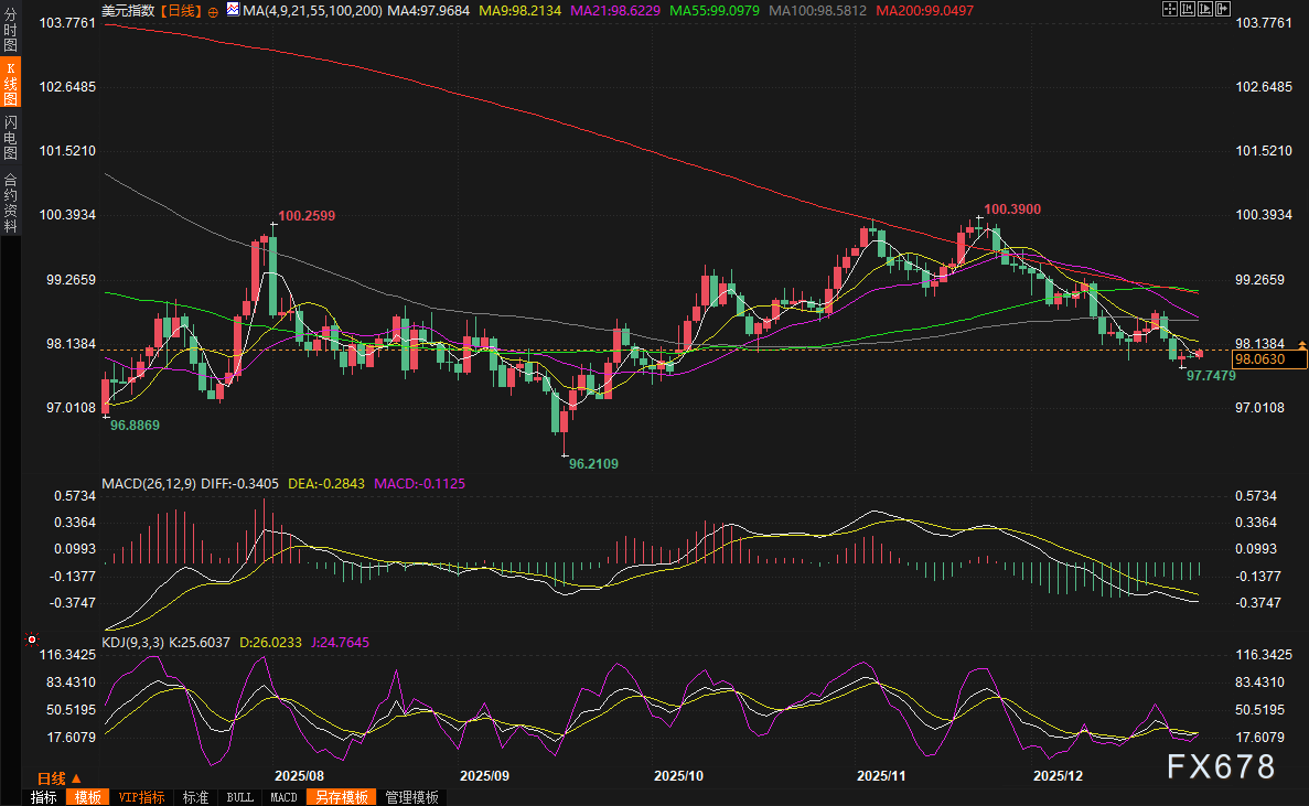 02025年即将画上句号,而美国美元指数(DXY)却以一种戏剧性的方式收尾。截至2025年12月26日,美元指数徘徊在98点附近,全年累计下跌约9.3%至9.7%,这不仅是自2017年以来最严重的年度跌幅,甚至可能接近2003年以来 ...