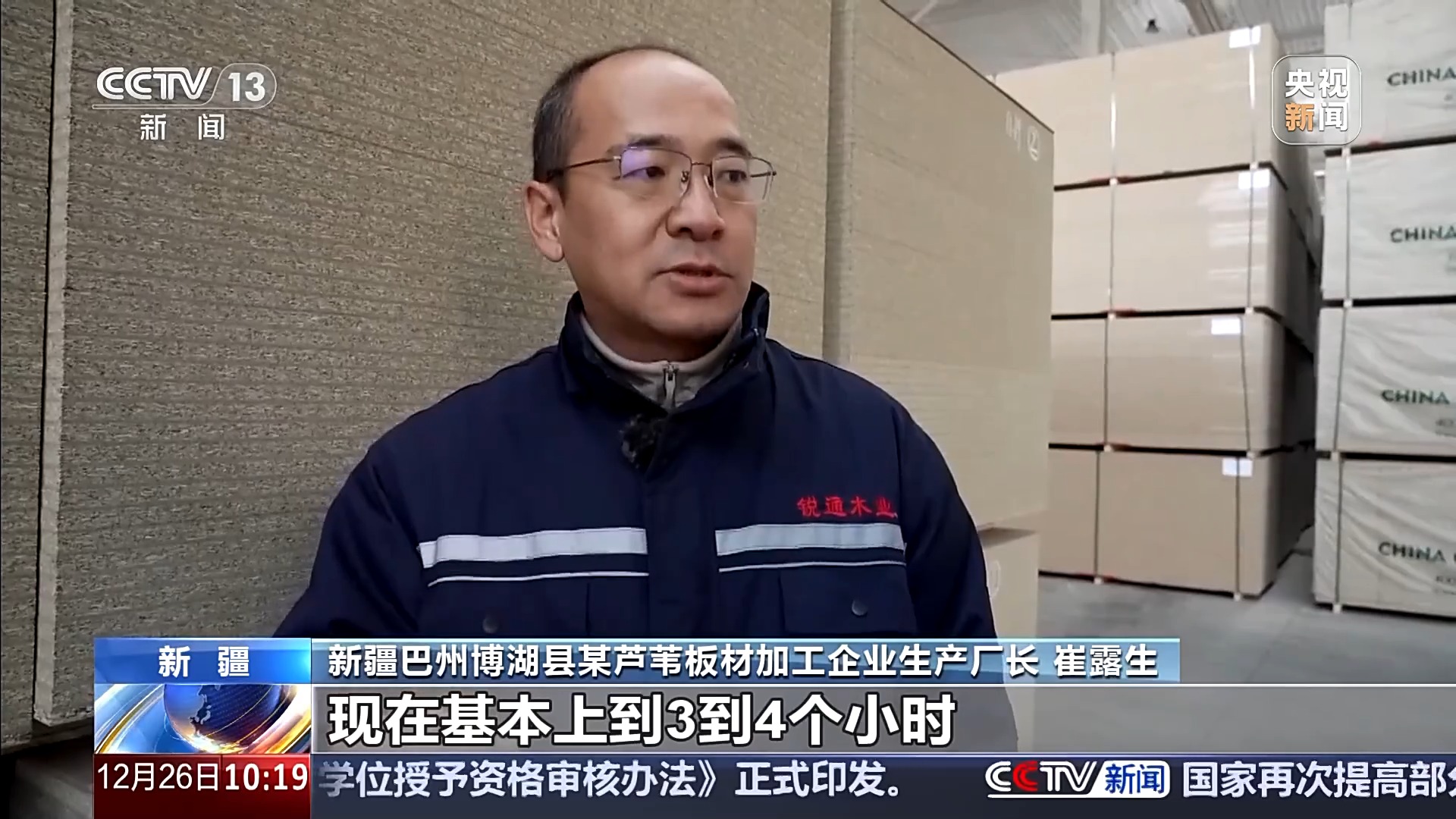 新疆巴州博湖县某芦苇板材加工企业生产厂长 崔露生:运输时间就从原来的8到9个小时,现在基本上到3到4个小时,我们整个的运输成本的话预计会下降20%到30%。乌尉高速的开通,对于我们打通中亚市场也还有非常大的支持作用。