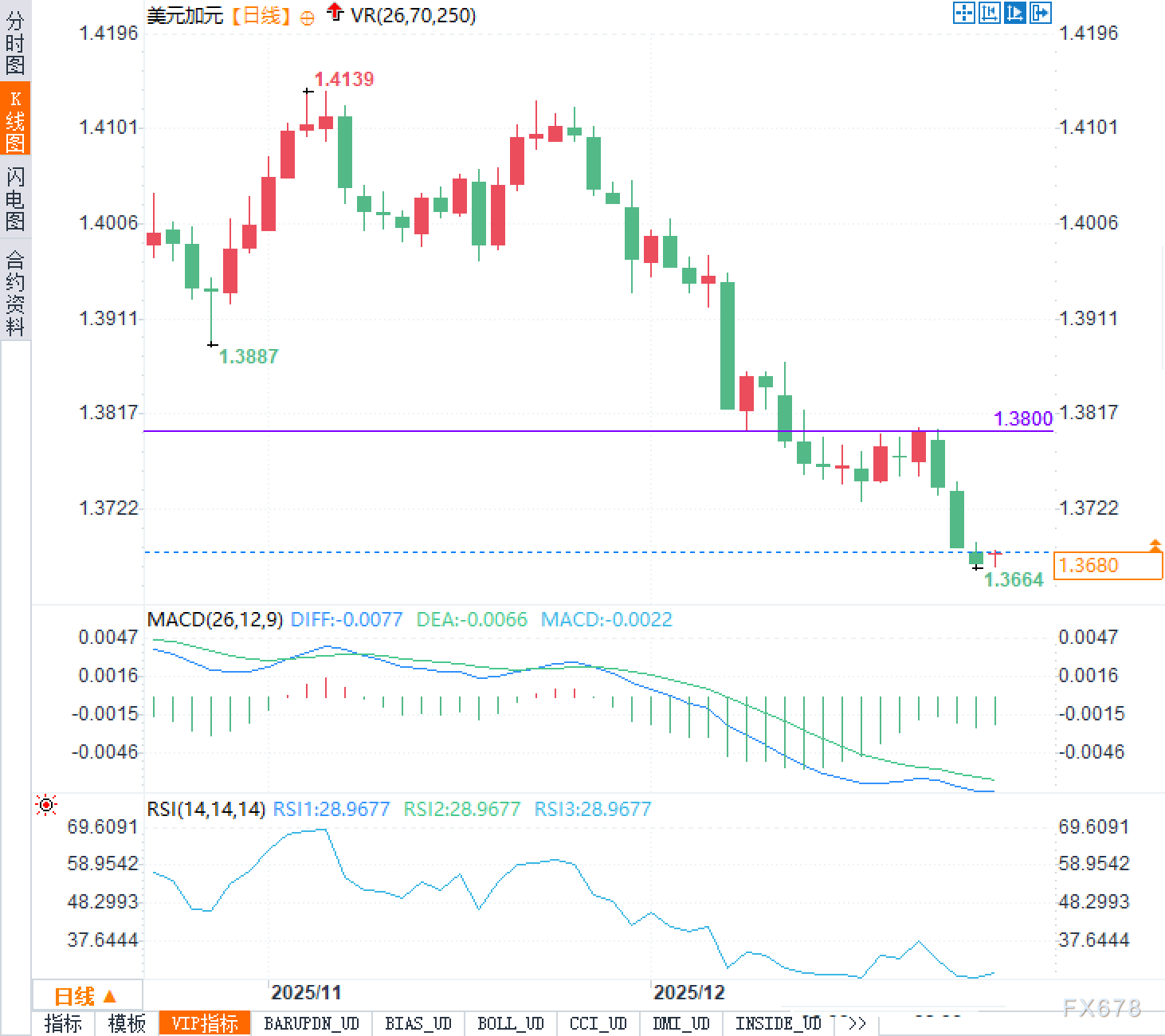 12月26日,星期五。近期外汇市场的主线仍围绕“政策预期再定价”展开:一方面,市场对美联储未来降息节奏的想象与现实数据之间存在拉扯;另一方面,能源价格的阶段性走强与北美贸易关系的不确定性,持续通过风险偏好与期限利差渠道影响加元表现。在这一背景下,美元兑加元延续弱势,欧洲时段报价1.3680。 ![]() 加拿大方面的政策表态为加元定价提供了另一条线索。加方强调需要时间让“增长与多元化”措施显效,并将“降低对单一外部市场依赖、拓展国际合作、推动国内产业”作为中长期议程的核心。这类叙事对汇率的影响通常并非立竿见影:短期内,市场更关注的是贸易谈判与关税环境对企业投资、出口订单与居民成本压力的边际影响;中期则会评估产业政策与对外协议能否转化为更稳定的经常项目与资本流入预期。尤其在加美墨协定审议临近的语境下,“不急于达成不利协议”的态度,既可能被解读为谈判纪律与底线意识,也意味着不确定性在时间维度上被拉长。对加元而言,时间越长,不确定性溢价越可能在汇率上体现;但若期间加拿大与其他经济体的合作进展被市场持续验证,也可能对冲部分外部冲击,减轻加元的被动性。 市场表现 美元兑加元的价格结构已经把“再定价”写在图形里。日线层面,汇价自前期高位回落后,1.3800附近的关键水平由支撑转为压力,市场记忆在该区域较为清晰;当前1.3680处于更低的波动区间,近期低点在1.3664附近,显示空头趋势仍占主导。动量指标方面,RSI处于约29的偏低位置,意味着短线情绪偏弱、卖压释放较充分;MACD位于零轴下方,反映下行趋势尚未出现明确的趋势扭转信号。需要强调的是,指标偏低并不自动等同于趋势结束,它更多揭示的是“波动的阶段性极端”与“情绪的单边化”,后续若出现基本面或利率预期的反向催化,更容易触发以回补与修正为主的价格波动。 ![]() 展望后市 若市场对美联储降息节奏的预期从“激进”回到“审慎”,美元的下行压力可能阶段性缓和;但若油价维持相对强势,同时加拿大在对外合作与国内产业推进上不断释放可验证的信息,叠加利差收敛的大方向不变,美元兑加元仍可能维持“趋势偏下、但易出现修正波动”的运行特征。区间视角下,市场对1.35至1.40的长期震荡讨论反映的是:在没有显著的利差单边与结构性冲击前,汇率往往更像是在为宏观变量的边际变化定价,而非展开单向行情。 综合而言,美元兑加元当前的1.3680既是近期下行趋势的结果,也是一组宏观不确定性与商品属性共同作用后的阶段性落点。短期波动仍会围绕“美联储路径再评估、油价弹性、贸易谈判不确定性”三条主线反复校准。