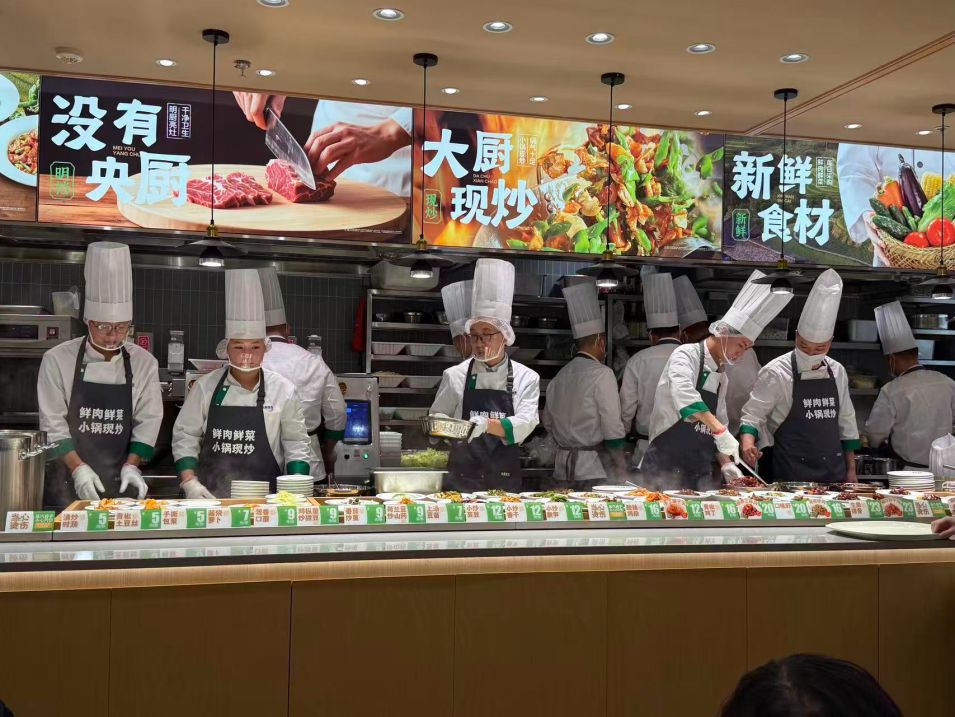 值得一提的是,2022年,“小弟”大米先生在门店数量和营收规模上均对“大哥”乡村基实现超越。今年9月中旬,大米先生又率先宣布门店数已突破1000家,而乡村基直至10月底才宣布达成同样规模。这意味着,大米先生用约一半的时间实现了与主品牌同等量级的门店扩张。 12月26日午间,《每日经济新闻》记者实地探访了大米先生北京首店开业首日的现场情况。记者观察到,取餐台面上可供顾客选择的菜品约有30种,开放式厨房内,约15名厨师正在忙碌。 面向选菜通道的厨师负责将炒好的菜品装盘,为顾客讲解和服务,其身后的厨师则专注于烹饪。与此同时,门店入口处有厨师正在现场切配肉类,其手边的操作台上摆放着装有生肉的透明保鲜盒、食用油桶等食材与厨具。在记者就餐期间,开放式厨房内持续传来阵阵炒菜声,烟火气十足。 据门店工作人员透露,大米先生后续计划在北京再开设5至6家门店,具体时间尚未最终确定,预计将在明年1月左右陆续开业。记者查询美团平台发现,除已开业的首家门店“北京常营约匯店”外,目前还有4家门店标注为“即将开业”状态。 记者还注意到,该家大米先生门店与乡村基2023年重返北京市场时的首店相距并不远。该乡村基门店客流似乎并未受到大米先生开业影响,也有不少顾客在排队选菜取餐。