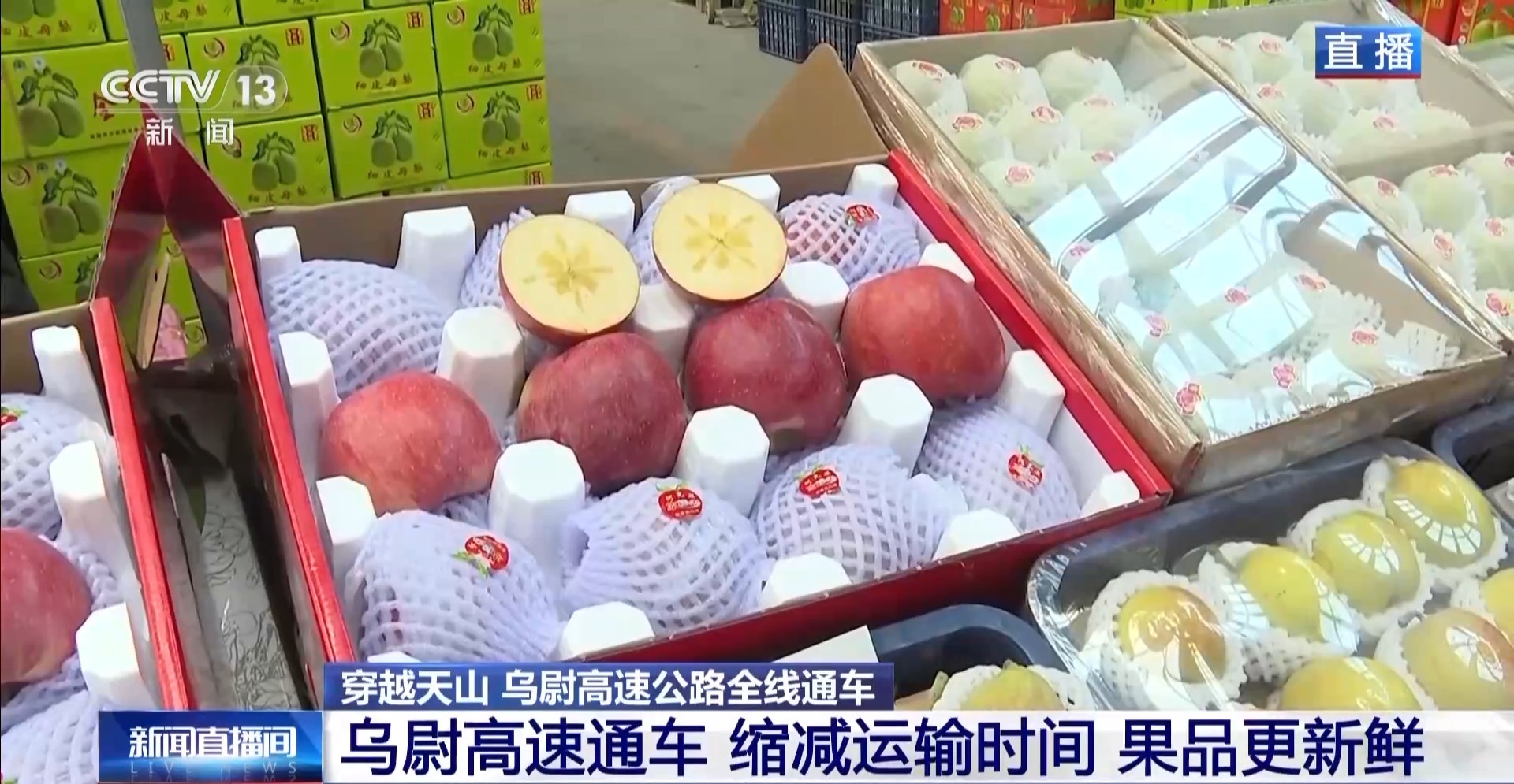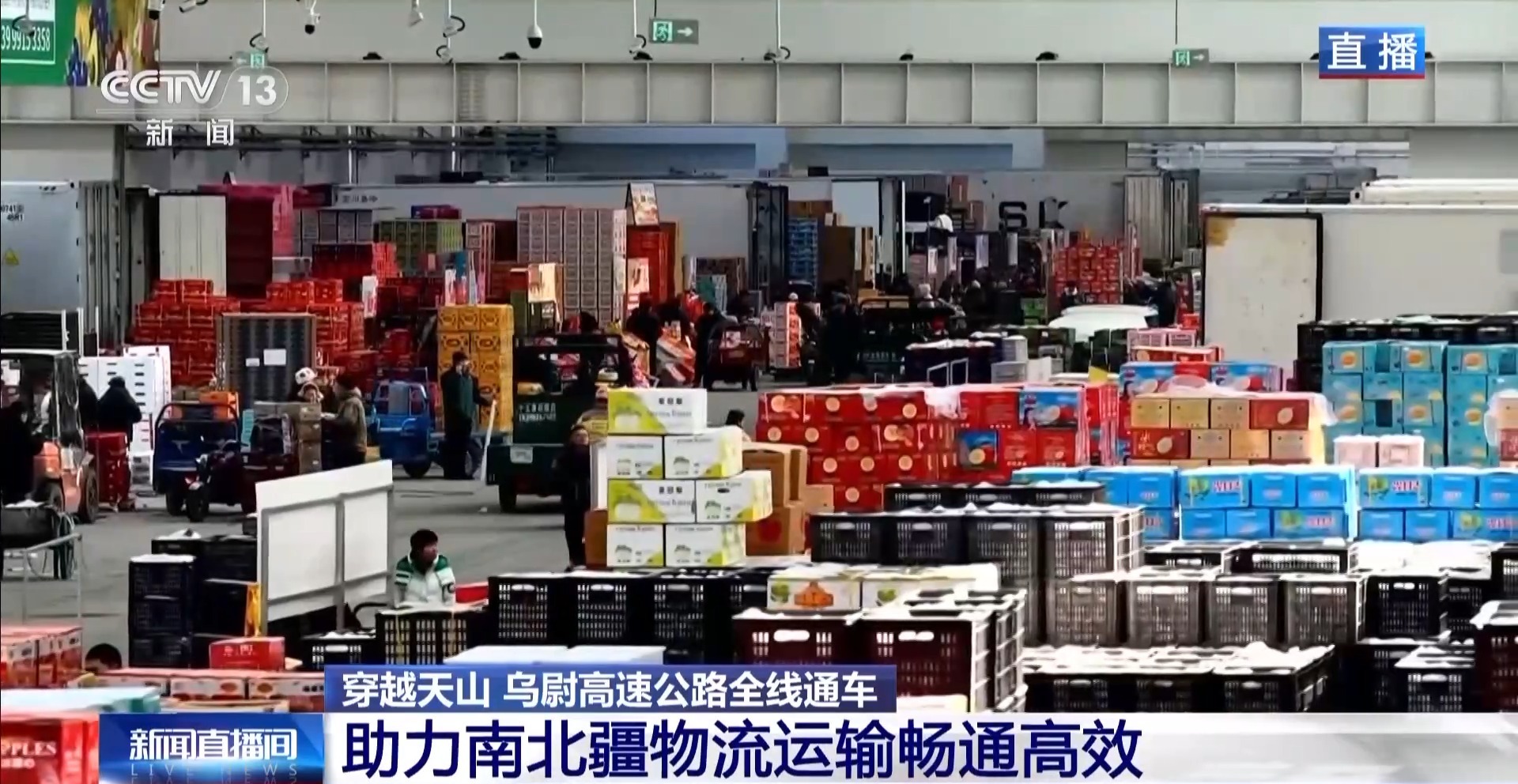 随着乌尉高速通车,库尔勒香梨、阿克苏苹果、和田大枣等南疆特色瓜果产品,将经由这条现代化高速公路实现快速运输,较以往显著缩短运输时间,有效降低物流成本,从而为南疆优质农产品走向乌鲁木齐及北疆市场注入强劲动能。 总台记者 卜鹏:乌鲁木齐市的九鼎农产品批发交易市场,是新疆最大的农产品批发交易市场,目前整个市场有2000多个商铺和摊位,每年的交易量可以超过200万吨。这个市场距离乌尉高速公路路线起点位置大概有20公里。