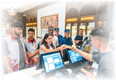 在浙江省义乌市福田街道商城社区,外籍消防志愿者向餐厅工作人员发放消防安全告知书。 钱旭升摄(人民视觉)