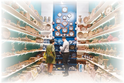 第八届进博会消费品展区,客商正在参观来自伊朗的陶瓷制品。 新华社记者 鲁 鹏摄