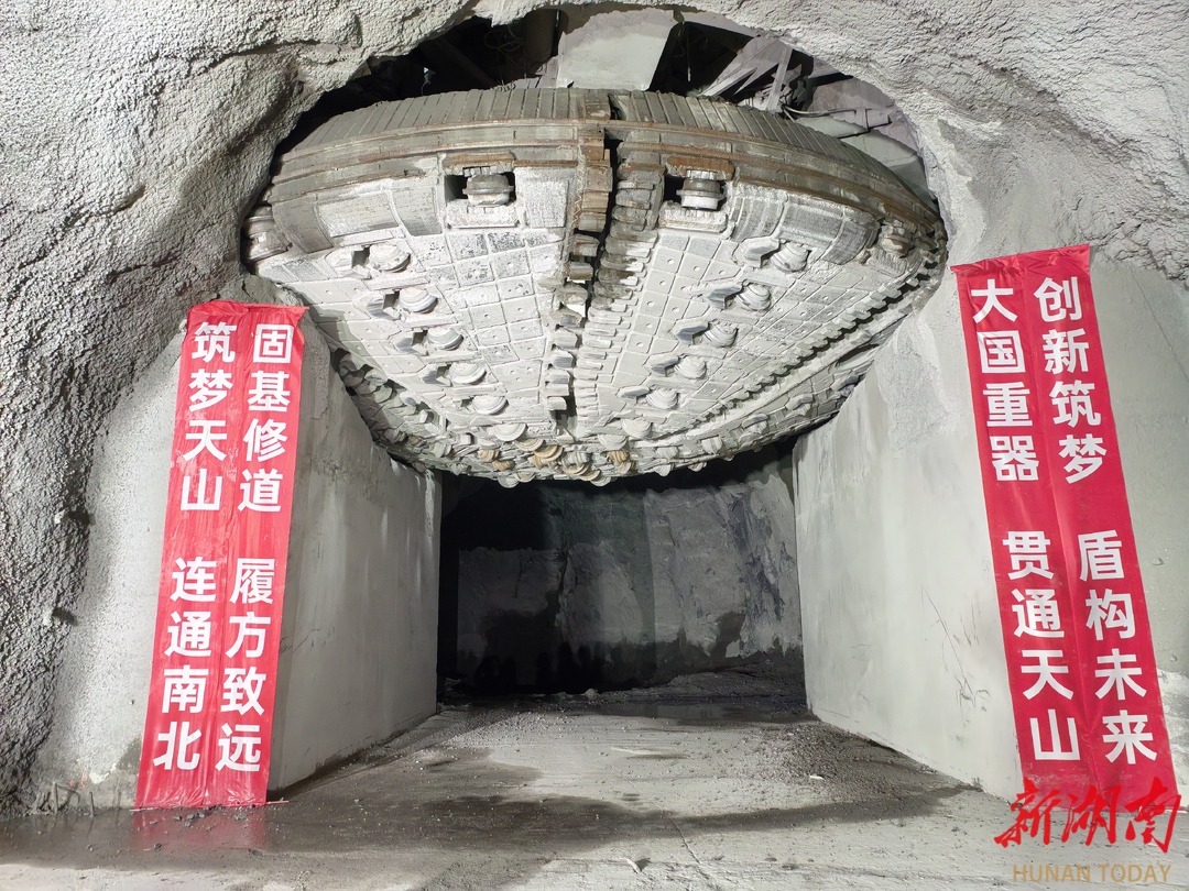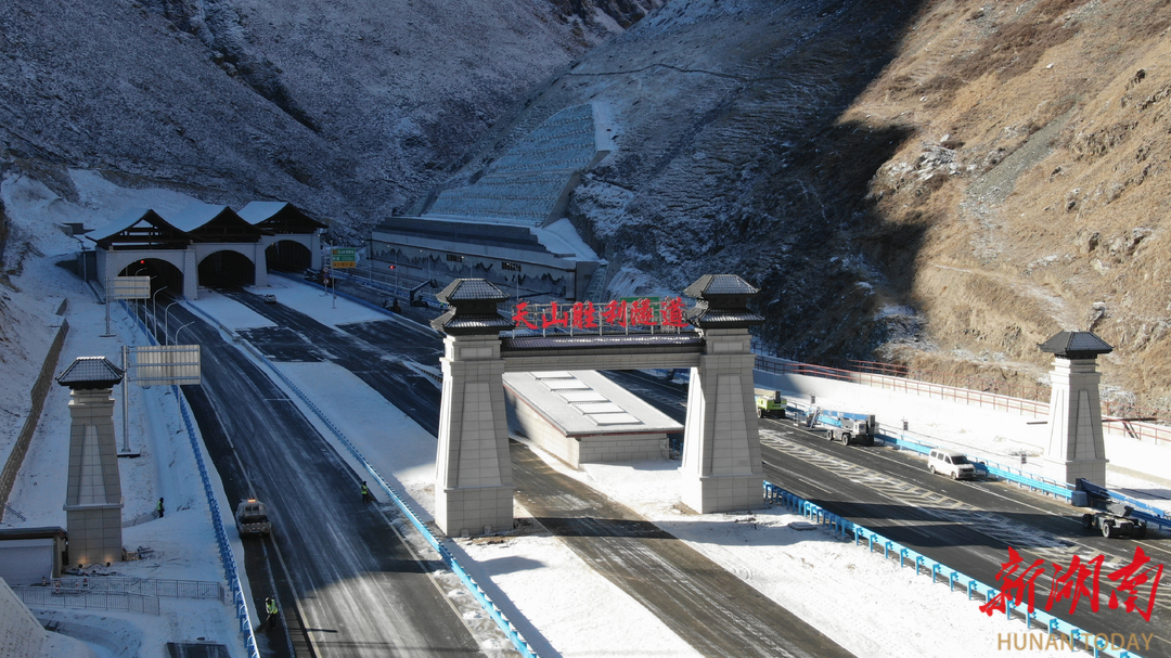 天山胜利隧道入口端。通讯员供图 天山胜利隧道于2020年3月开工,工程建设无比艰巨,如果采用传统钻爆法,预计耗时72个月左右。建设团队直面高寒、高海拔、高地震裂度、超大埋深等多重世界级难题,经反复研究论证后,首次在高速公路隧道领域使用“TBM中导洞+主洞钻爆法”组合工艺,即在左右两个主洞间增加一个中导洞,由中交集团自主研制的硬岩掘进机(简称TBM)担当“开路先锋”,为左右洞开出更多作业面,实现“长隧短打”。最终,历经52个月的攻坚克难,天山胜利隧道于去年底提前贯通。以前翻天山要3小时,现在驱车只需约20分钟。 打通天山胜利隧道,横向创下“世界最长”,纵向攻下“世界最深”。隧道上方有多处竖井,如同开启“天窗”作为隧道的“呼吸系统”。其中,2号竖井地处海拔3660米,开挖直径11.4米、最大深度707米。项目团队采用世界首台超大直径全断面硬岩竖向掘进机“首创号”,不施爆破,在天山深处实现“一钻成井”,创下高速公路竖向掘进机施工竖井深度、直径、海拔三项世界纪录,为世界公路建设提供了“中国智慧”。