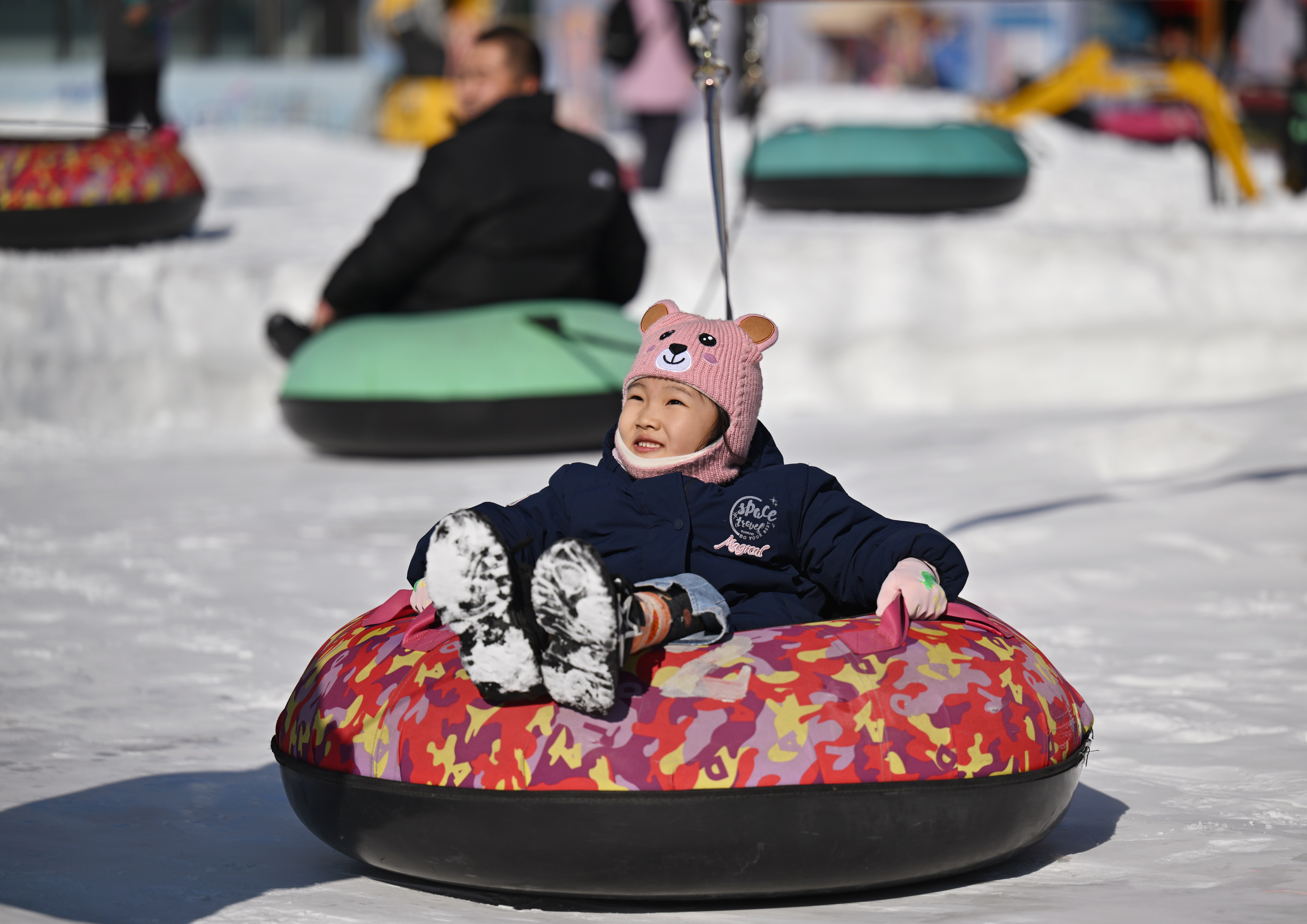 ↑2025年2月4日,小朋友在天津市西青区中北镇一雪场玩耍。