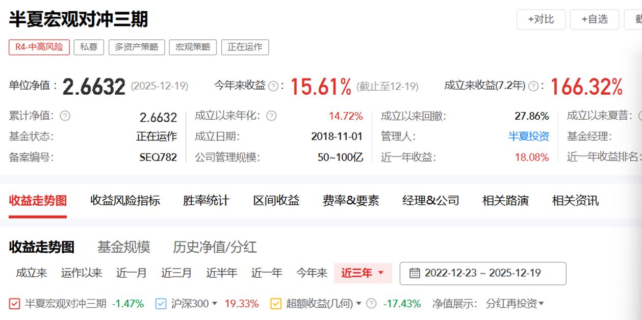 而另一只半夏宏观对冲三期私募基金,自成立以来至2025年12月19日,收益率为166.32%,年化收益率为14.72%。同样,近三年该私募产品收益率为-1.47%,同期跑输沪深300约19个百分点。