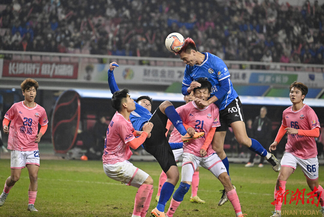 热情似火的常德队球迷。 19时45分,决赛正式开始。永州队率先占据场上主动,多次制造威胁,一波接一波的攻势直到下半场第58分钟转化为比分变化——在一次角球形成的门前围攻中,永州队连续打门,尽管常德队门将及后卫也上演精彩的扑救和解围,但最终未能阻挡永州队46号谷文杰的头球破门。