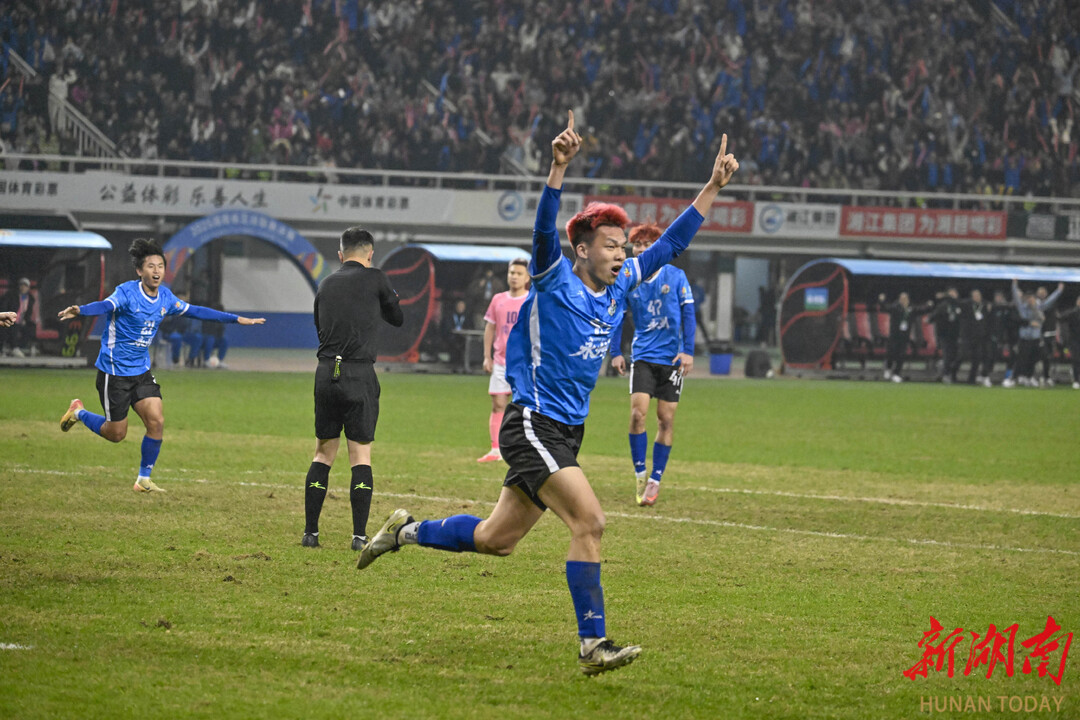 永州队进球瞬间。 随着终场哨响,永州队以1比0的比分赢得桂冠。全场瞬间沸腾起来,欢呼声、呐喊声此起彼伏。