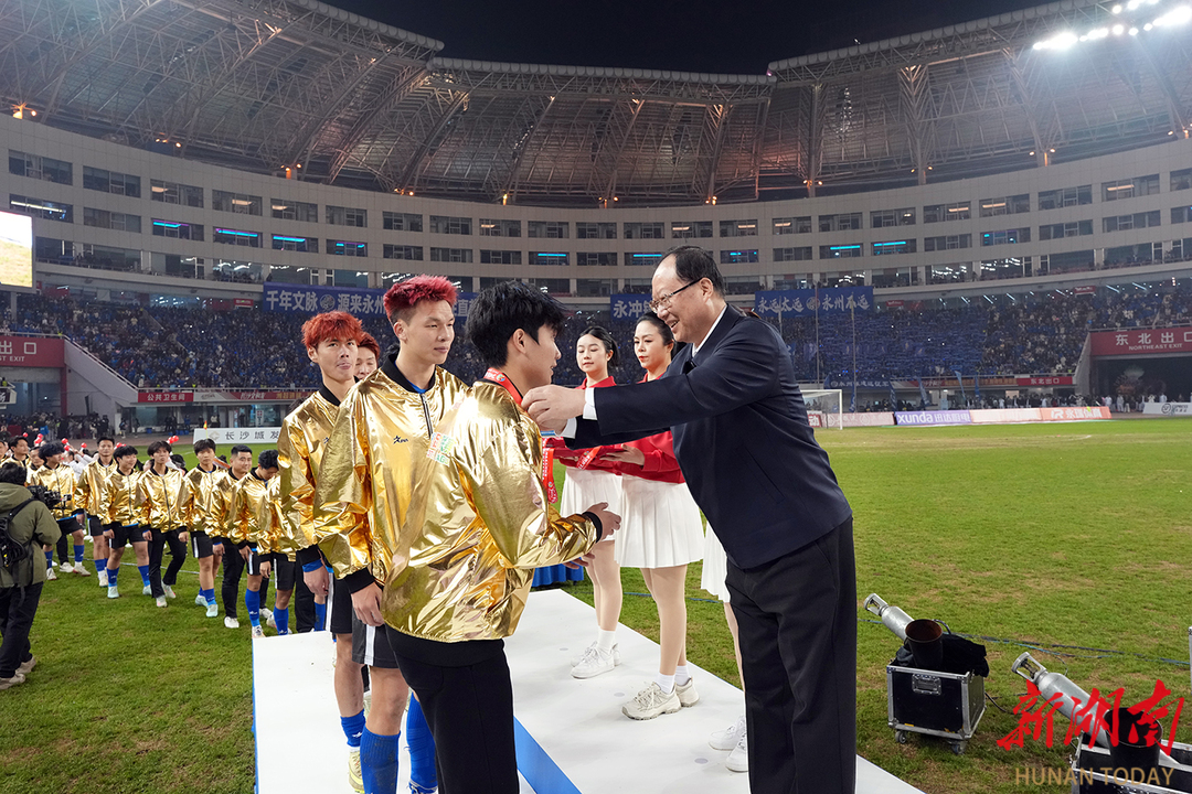 绽放湖湘风采放飞青春梦想 永州队夺取2025湘超联赛冠军 何报翔到场观赛毛伟明颁奖 27日晚,2025湖南省足球联赛(简称“湘超联赛”)在长沙贺龙体育场上演巅峰对决。经过90分钟的鏖战,最终永州队以1∶0战胜常德队,夺得2025湘超联赛冠军。全国政协副主席、民革中央常务副主席何报翔到场观赛,省委副书记、省长毛伟明为冠军球队颁奖。 省领导及老同志吴桂英、张迎春、王道席、刘红兵、杨浩东、周农、蒋涤非、李建中、谢勇,中国工程院院士田红旗,省政府秘书长瞿海观看比赛。