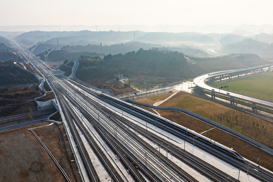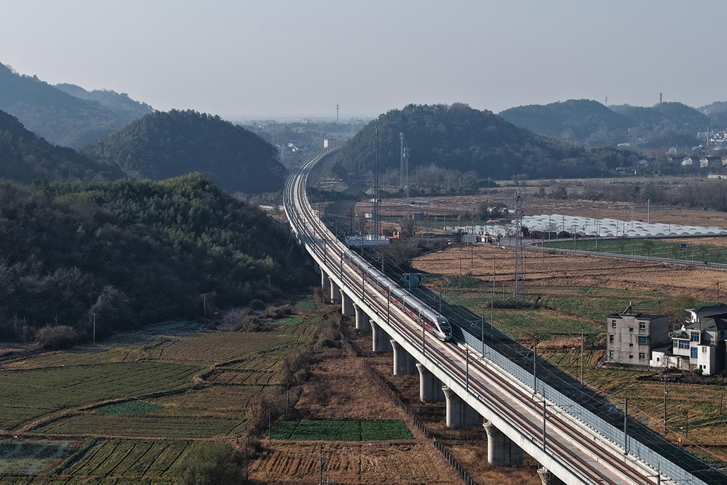 12月26日,首趟始发列车C3132次行驶在杭衢高铁跨龙丽温高速公路特大桥上(无人机照片)。 高铁从“连点成线”到“成环” “十四五”时期的高铁运营里程在高位上的再突破,也直接带来的是高铁网络形态与功能的再优化。 数据显示,目前高铁网络已覆盖全国97%的城区人口50万以上城市。同时,500公里半径内城市群基本形成1至2小时交通圈,1000公里跨区域城市间4小时通达,2000公里跨区域城市间实现“朝发夕至”。全国高铁单日可发送旅客1600万人次,相当于,每天有一个超大城市的人口通过高铁网流动。 这背后对应的一个非常直接的变化就是,大量中小城市也纳入了全国高铁网。如此次包银高铁,就结束了内蒙古巴彦淖尔、乌海不通高铁的历史;12月5日全线贯通运营的南凭高铁崇左至凭祥段,则让凭祥、宁明、龙州、崇左等地一举跨入高铁时代;沪渝蓉高铁武汉至宜昌段的开通,也让钟祥、京山、当阳等多个城市实现高铁梦…… 可以看出,相比上一阶段高铁建设主要是围绕中心城市的“连点成线”,这一时期的高铁建设已越来越明显地转向补齐路网空白、增强整体线网运营效率的方向发展,这让更多的区域都有机会融入了全国高铁大网络,实现基础设施上的协同发展。由此,高铁网络的完善也在更有力地重塑区域发展格局。 一个有代表性的现象是,这一过程中,出现了越来越多的跨区域高铁环线。如去年6月,“上海—上海虹桥”的超级环线高铁闪亮登场,这条从上海出发的首条环线高铁,横跨沪苏浙皖三省一市,标志着“轨道上的长三角”加速推进。而此次全线贯通的包银高铁,更是与银西高铁等6条线路一起,构成了一条串联西北、华北5省区的高铁环线。 此外,新开通运营的沪汉蓉高铁武汉至宜昌段,也让武汉、襄阳、宜昌“金三角”高铁大环线从蓝图变为现实。而高铁成环越来越多,意味着高铁路网的整体效能进一步提升,对沿线经济社会发展的带动作用也将更明显。