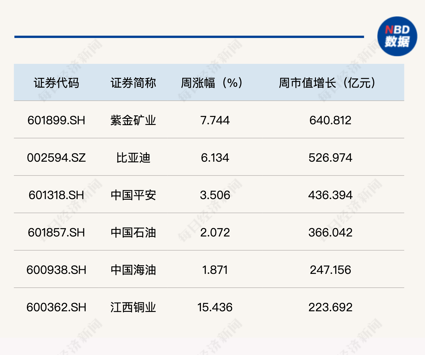 成分股方面,江西铜业本周涨幅达到15.44%,紫金矿业、比亚迪以及拼多多的周涨幅同样超过5%。周市值增长方面,紫金矿业和比亚迪的周市值增长均超过500亿元。