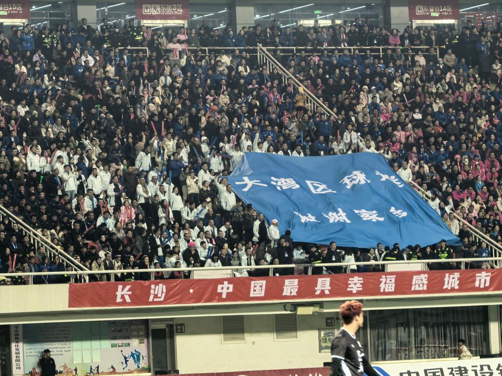 12月27日,球迷在永州市体育场观看“湘超”决赛直播。新华社发(郭磊 摄) 我们看见足球跨越山海 “湘超”举办期间 大湾区湖南人队、吐鲁番队 与“湘超”球队进行多场友谊赛 “欢迎回家” “谢谢家乡” 乡情、友情通过足球升华 决赛时人们发现 体育场的座位里除永州、常德专区 还有大湾区、吐鲁番专区 开赛后 常德球迷身着粉色球迷服 永州球迷身着蓝色球迷服 在他们中间的东看台最佳观赛区 身着白色衣服的球迷打出标语 “大湾区球迷 谢谢家乡”
