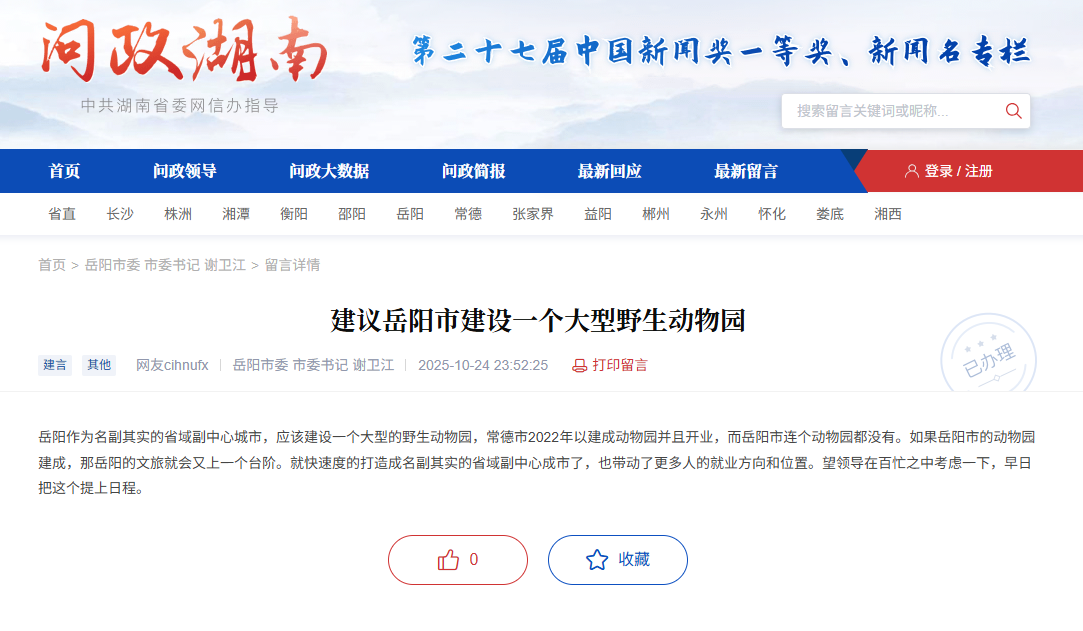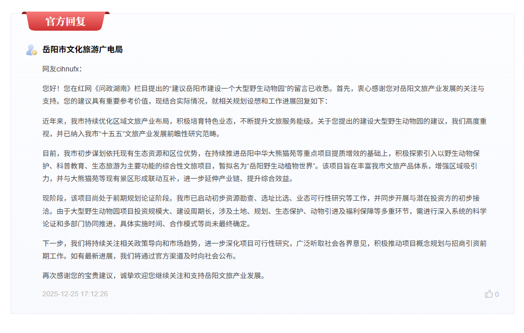 红网时刻新闻12月29日讯(记者 陈星晓)近日,有网友在红网《问政湖南》栏目留言,建议岳阳市建设一个大型野生动物园,以提升文旅竞争力、带动就业,助力省域副中心城市建设。该建议得到岳阳市文化旅游广电局的详细回应。 网友在建议中指出,岳阳作为省域副中心城市,目前尚无动物园,而常德等地已建成运营。建设野生动物园有望推动岳阳文旅产业再上台阶,增强城市吸引力与就业带动能力。 对此,岳阳市文化旅游广电局回应称,网友的建议被高度重视,并已纳入岳阳市“十五五”文旅产业发展前瞻性研究范畴。目前,岳阳市初步谋划依托现有生态资源和区位优势,在持续推进岳阳中华大熊猫苑等重点项目提质增效的基础上,积极探索引入以野生动物保护、科普教育、生态旅游为主要功能的综合性文旅项目,暂拟名为“岳阳野生动植物世界”。项目旨在与现有景区如岳阳中华大熊猫苑等形成联动,进一步延伸产业链、提升综合效益。 回复中说明,项目目前处于前期规划论证阶段,岳阳市已启动资源勘查、选址比选、业态可行性研究等工作,并与潜在投资方进行初步接洽。由于大型野生动物园项目投资规模大、建设周期长,涉及土地、规划、生态保护、动物引进及福利保障等多重环节,需进行深入系统的科学论证和多部门协同推进,具体实施时间、合作模式等尚未最终确定。 岳阳市文旅广电局表示,将继续深化可行性研究,广泛听取社会各界意见,积极推动项目概念规划与招商引资前期工作,如有最新进展,将通过官方渠道及时向社会公布。