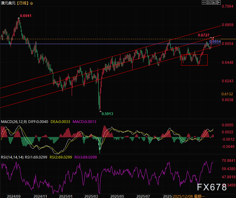 0周一(12月29日)澳元兑美元汇率延续强劲上行态势,周一盘中攀升至0.6727的14个月高位,较前一周0.6714的收盘价进一步突破,巩固了年末反弹势头。回顾近期表现,澳元上周录得1.6%的大幅上涨,不仅触及0.6724的阶段 ...