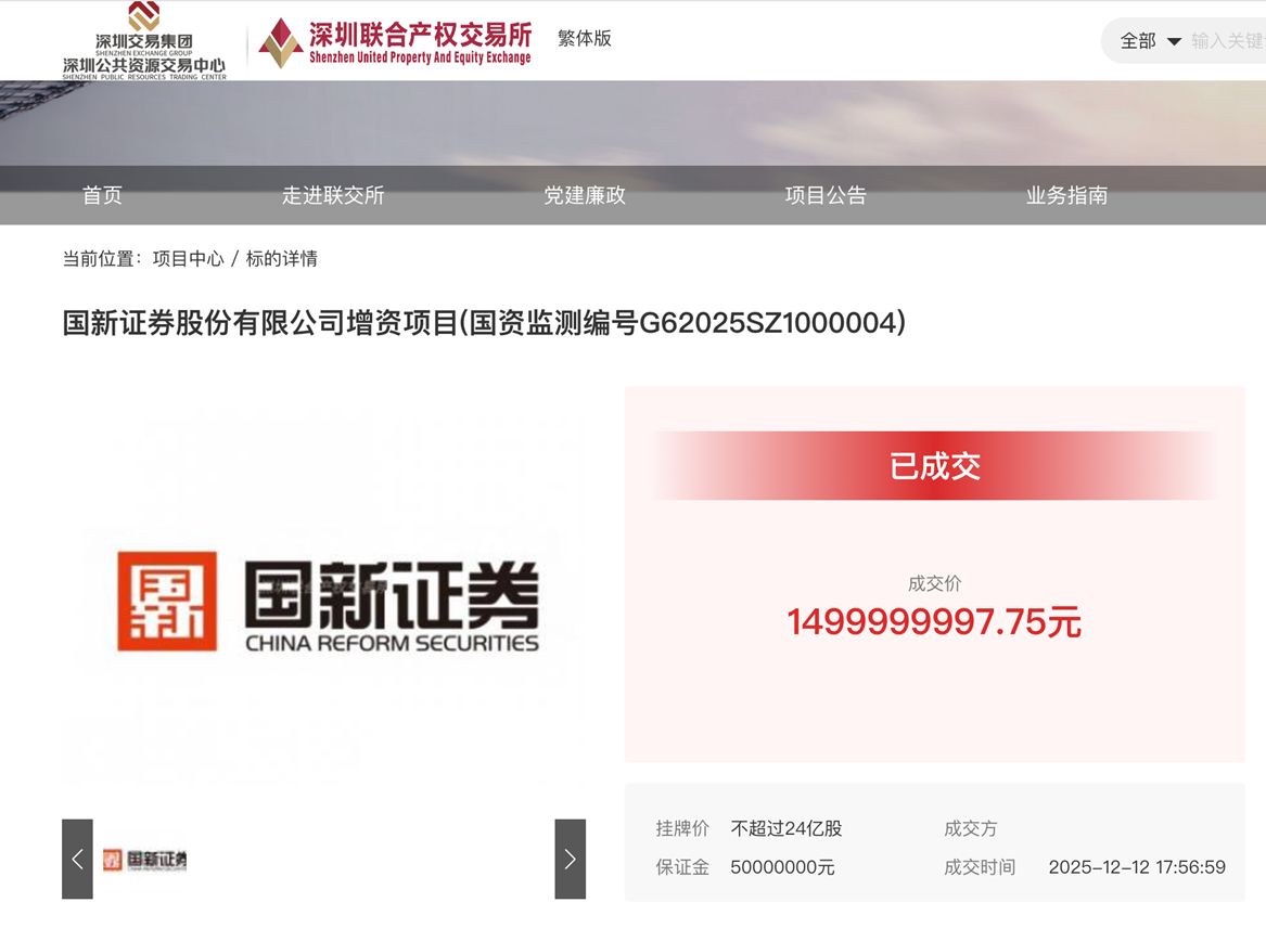 备受市场关注的国新证券增资扩股项目,在2025年岁末终于画上了阶段性的句号。深圳联合产权交易所披露的信息显示,国新证券此次增资事项已经落地,募集资金总额约为15亿元。