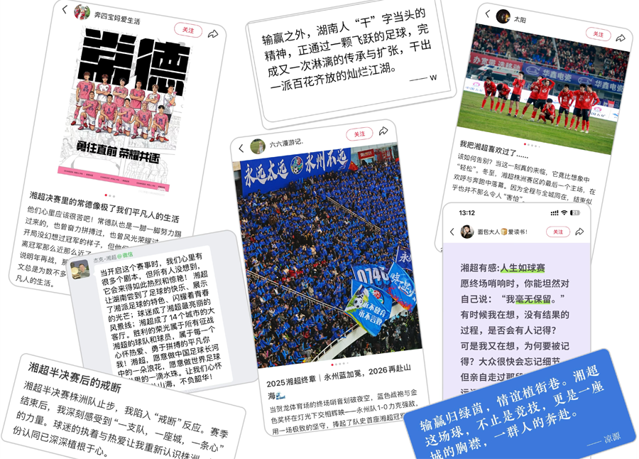 红网时刻新闻诚邀你,一起记录你的湘超故事: 🌟湘超赛场上触动你的瞬间 🌟想对球员/球队说的心里话 🌟对明年湘超的展望与寄语 🌟或任何你与湘超有关的记忆 …… 征集主题: 我与湘超的记忆 参与方式: 将你的故事/记忆整理成一段文字(可配有图片),发布在本篇稿件评论区。欢迎邀请好友为你的评论点赞,加持你的中奖值! 活动时间: 征集截止时间:2026年1月5日10:00 评选结果公布:2026年1月12日 活动奖励: 精选10名网友评论,赠送图文纪实作品《热辣湘超》,优质内容还将入选收录红网专题《我们的2025湘超记忆》。