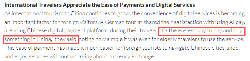 文章援引旅游专家的话说,延长免签政策,加上越来越多的地区旅游和文化体验,推动了这一转变。游客现在更倾向于游览多个城市和地区,从北京的古迹到中国广阔乡村的自然美景都具有吸引力。 文章分析说,随着中国国际旅游业的持续增长,数字服务的便利性正成为外国游客考虑的重要因素。一位德国游客分享了他对使用中国领先的数字支付平台的满意度。他说:“这是在中国支付和购物最简单的方式。”他说,这种便捷的支付方式使外国游客更容易在中国城市中导航、购物和享受服务,而不用担心货币兑换问题。支付方式和其他服务的数字化正使中国作为旅游目的地的吸引力越来越大。
