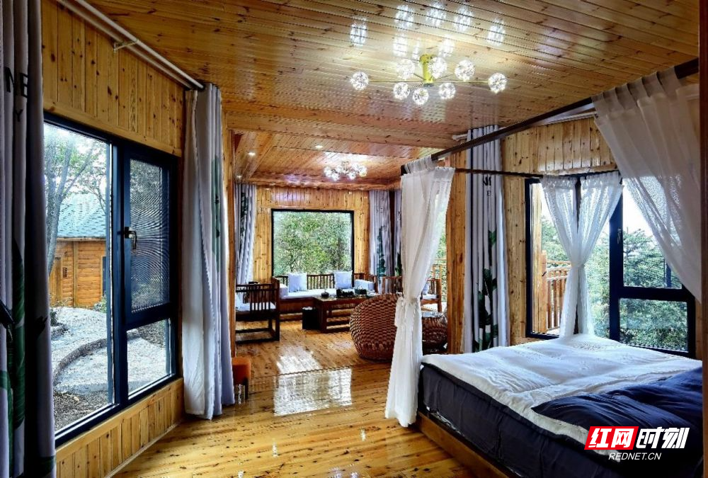 龙瑶幽梦谷民宿内部环境。 龙瑶幽梦谷聚焦高品质民宿集群建设,深度融合区域山水肌理与乡村特色。其坐拥3800亩原始森林秘境,民宿依山而建且每间配备独立观景阳台,17栋复古与轻奢风融合的独立小木屋房型、布置风格各异;整合森林资源配套餐饮、亲子、露营等多元业态,打造“观景+品茗+阅读”文化休憩空间,推出森林徒步、观星、康养等体验项目,构建“民宿+生态+文化+休闲”一体化度假场景,凭借海拔优势形成的夏季平均21度气候已成为避暑康养度假绝佳之地,为游客提供兼具舒适度与体验感的乡村度假选择,有效带动周边乡村旅游消费与村民增收。