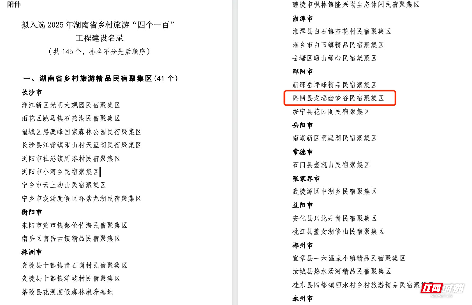 红网时刻新闻12月30日讯(通讯员 陈晓佳)近日,湖南省文化和旅游厅公布了《2025年湖南省乡村旅游“四个一百”工程建设名录》,隆回县虎形山瑶族乡草原村、龙瑶幽梦谷民宿聚集区分别入选“湖南省乡村旅游精品村”和“湖南省乡村旅游精品民宿聚集区”,为当地文旅融合发展与乡村振兴再添省级名片。