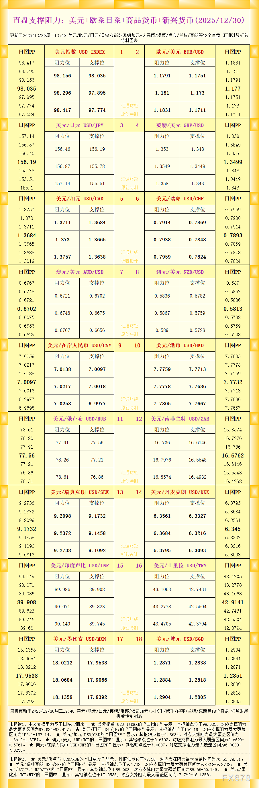 0一张图看直盘支撑阻力:美元+欧系日系+商品货币+新兴货币,更新于2025年12月30日周二12:40,具体美元/欧元/日元/英镑/瑞郎/澳纽加元+人民币/港币/卢布/兰特/克朗等18个直盘,更多详见汇通财经析若特制图表中的内 ...
