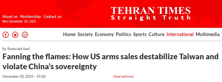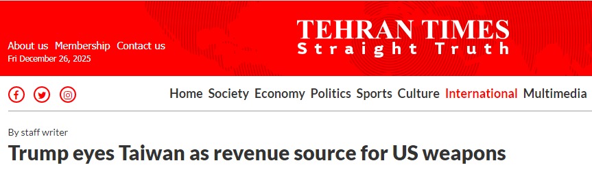文章援引英国《卫报》的报道说,美国政府及五角大楼要求民进党当局将“防卫预算”提升至GDP的10%,比例远高于美国或其任何主要盟友的军事支出。而这一要求也证明了,美国政府通过军售实现自身利益最大化的企图。 《德黑兰时报》网站在另一篇文章中写道,美对台军售美其名曰是为了维护台海和平与稳定,但这样的说辞根本站不住脚。在敏感地区投入武器灭不了火,只能是“煽风点火”。民进党当局愈发沉迷“以武谋独”的危险幻想之中,台湾成为美国操弄地缘政治的一枚棋子,其安全被押在美国的战略博弈上。