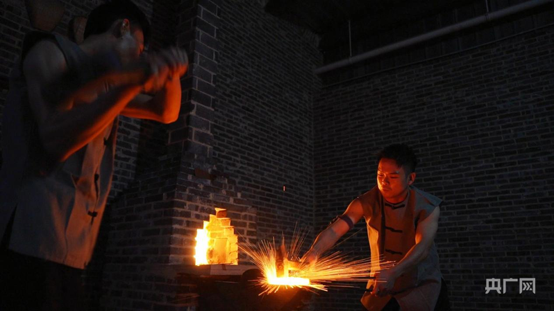 “飞天”刀剪第五代传承人黎勇正在打铁(央广网记者 白刁尹 摄) 大街小巷中,“叮叮当当”的打铁声,是每个龙水人儿时的记忆。铁匠炉燃着熊熊烈火,重庆老字号“飞天”刀剪第五代传承人黎勇,正弓着身,手握长钳,稳而准地夹出烧得通红的铁块,一锤落下,火星如烟花般迸溅,粒粒光点,勾勒出“中国西部五金之都”炽热的匠心图景。 五代人一把锤 “老手艺”淬“新匠心” 翻开尘封的历史,大足五金问世比大足石刻还要早百余年。据史料记载,大足五金可追溯至晚唐时期。最初是冷兵器时代的铁器淬炼,随后在大足石刻开凿的岁月里,锻造成供人千凿万刻的匠具,而今,它已演化为生活中包罗万象的五金制品。“千锤百炼”的执着与坚守,早已融进龙水人的血脉。