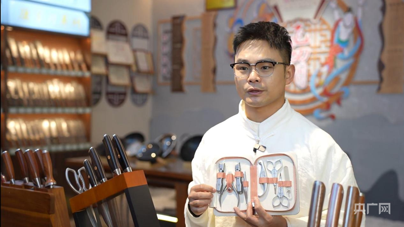 罗孝均正在炼制菜刀(央广网发 杨丹 摄) 代代相续的匠心传承,镌刻进时光的脉络里。自2009年“龙水小五金锻打技艺”列入重庆市非物质文化遗产起,这项扎根于当地的技艺便持续被珍视与守护。如今,它不仅体现于“飞天”这样的老字号品牌之中,而是被纳入全域性的保护与传承体系,成为整座小镇的文化共识。 五金烟火漫卷 “老字号”闯“新国潮” 老手艺要守住根脉,新技术更要拓开新路。现在越来越多的五金企业正积极拥抱电商浪潮,通过反向定制顺应年轻化的消费趋势。 黎勇在直播间拿起一款名为“海棠依旧”的五金产品说,“这是一款专为女性打造的指甲护理套装,取这个名字的灵感来源于我们大足的区花‘海棠’。别处的海棠大多无香无实,唯独大足海棠,有香气,结果实。”这独一份的特质,仿佛为五金也赋予了生命。 这款产品的亮点在于指甲的打磨设计。“很多人剪指甲后需要打磨,传统工具往往效果不佳。”黎勇说,“我们采用了新型材料,打磨后的指甲会自然呈现光泽,犹如做了美甲般亮丽。”