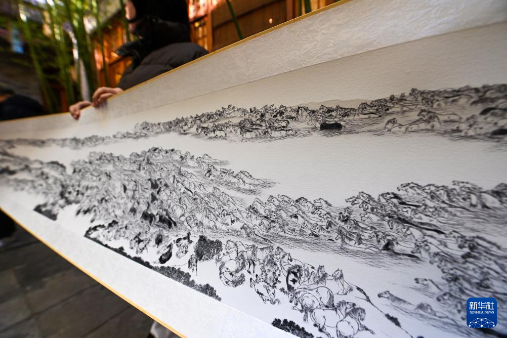 这是12月29日在天津古文化街“喜迎马年,五代画马人马画艺术展”上拍摄的画家宫春虎的作品《万马图》(局部)。 新华社记者 赵子硕 摄