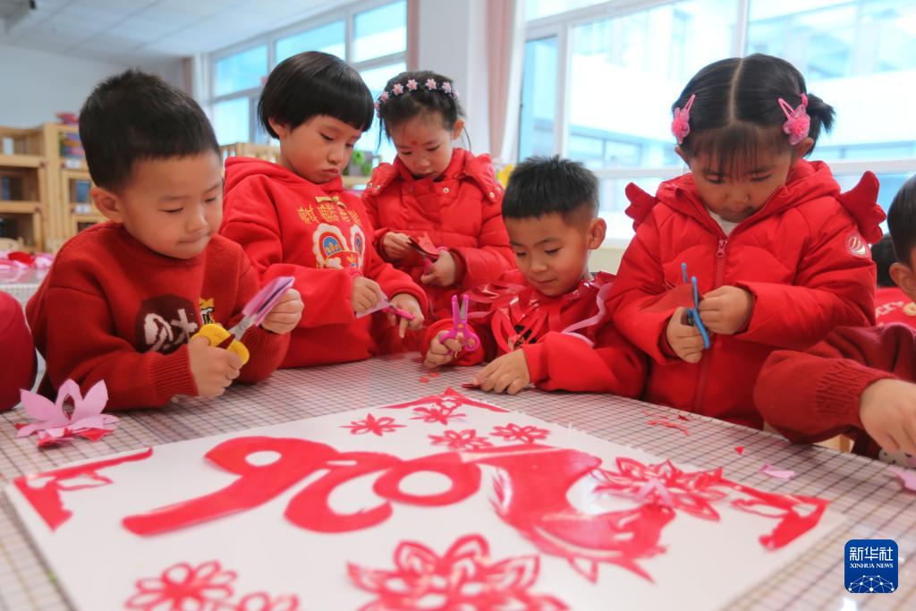 12月29日,河南省焦作市温县第三幼儿园的小朋友在进行迎新年剪纸创作。 新华社发(黄福兴摄)