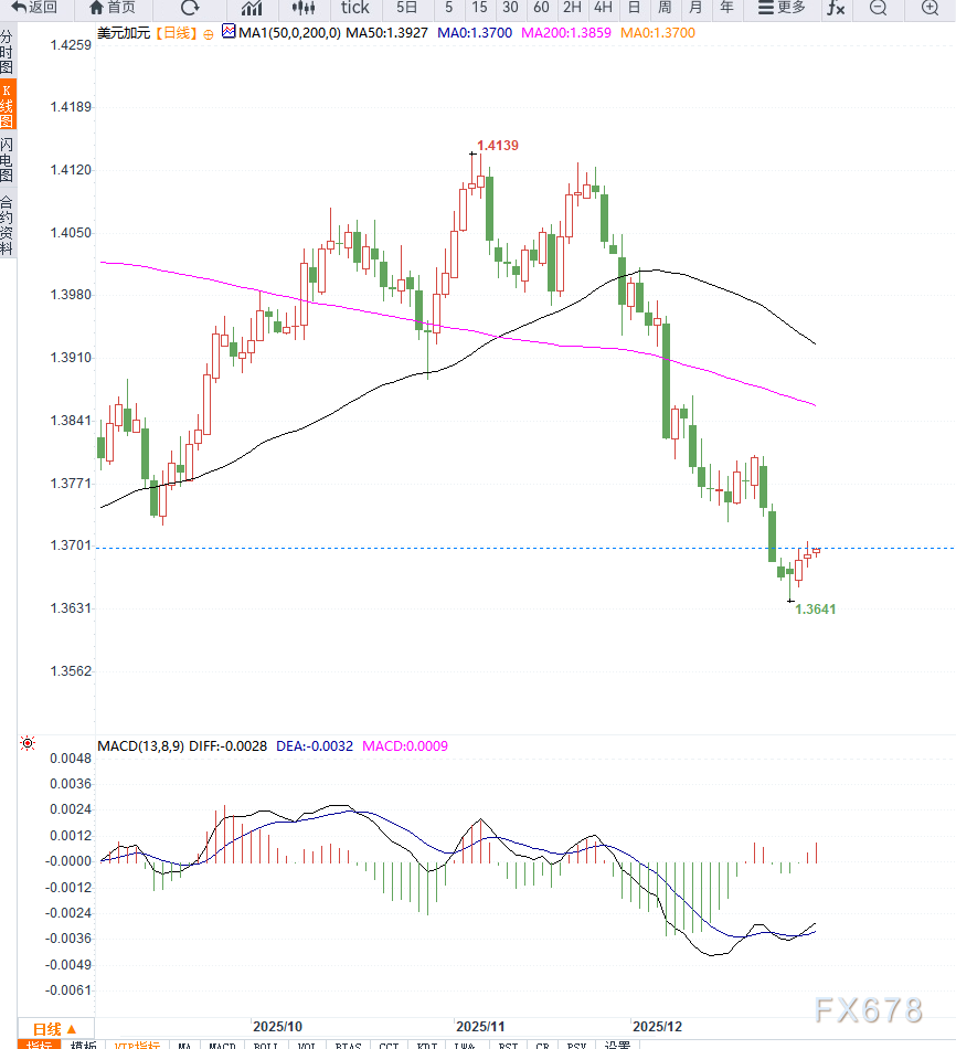 周三亚市时段,美元兑加元(USD/CAD)围绕1.3700一线小幅波动,进入年末最后一个交易日,整体成交清淡,汇价延续整理走势。 ![]() 纪要指出:“多数与会者判断,如果通胀按预期随时间下降,进一步降息可能是合适的。” 最新数据显示,美国11月CPI同比增速降至2.7%,低于9月的3.0%,强化了市场对通胀降温趋势的判断,也为未来政策继续宽松提供了数据基础。 加元方面表现相对平稳。市场普遍预期,加拿大央行(BoC)在短期内不会调整利率。这一判断主要源于加拿大通胀在过去数月持续维持在2%左右的目标区间,使央行具备保持政策耐心的空间。 在缺乏新的经济冲击下,加元波动性明显受限。 从日线结构看,美元兑加元仍处于高位横盘整理格局。汇价在1.37整数关口附近反复拉锯,显示多空力量相对均衡。短期均线(5日、10日)走平,对价格指引有限;RSI指标位于50附近,动能中性; MACD贴近零轴运行,尚未给出明确趋势信号。整体而言,在缺乏新的基本面催化前,USD/CAD更可能维持在1.3650—1.3750区间内震荡。 ![]() 当前美元兑加元的走势更多受到年末流动性下降和仓位调整影响,而非基本面发生实质性变化。美联储虽保留进一步降息空间,但节奏偏谨慎;加拿大央行则因通胀稳定而维持观望,政策分化有限。 在新一年宏观数据和央行信号进一步明朗之前,USD/CAD大概率延续区间整理走势。