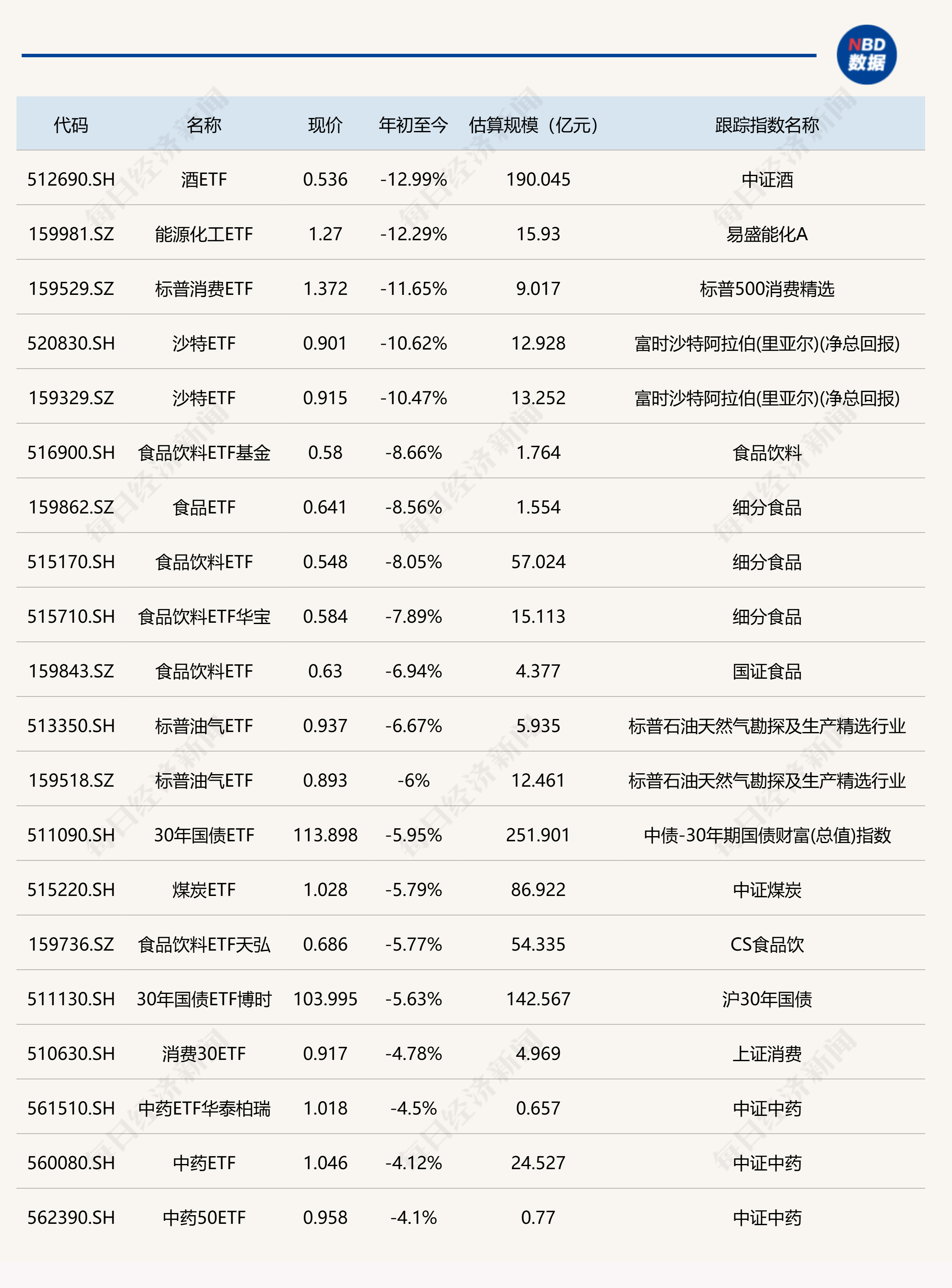 有券商表示,AI可能是自云计算以来最大的产业机会。从硬件层面看,除GPU保持较快增速之外,ASIC可能在明年成为第二增长引擎,北美算力产业链条业绩有望在后续几个季度保持较高增速。从需求端看,北美云厂商云收入增长和资本开支投入形成共振,人工智能闭环清晰,发展仍处上升通道。 当前AI趋势明确,国内外云厂商资本开支高增,通信板块作为“卖铲子”的算力行业,市场规模有望持续增长。 对于有色方面,结合库存数据与行业周期来看,当前LME铜、铝的全球库存整体仍处于低位,机器人、新能源汽车以及新能源装机等新兴产业的快速发展,正在同步推升铜、铝等工业有色金属的需求;而供给端方面,近几年全球铜矿开采量增速出现放缓,全球铝的产能也已经达到高位,新增产能受限,因此,未来铜、铝等工业有色金属的供需仍将维持紧平衡,价格易涨难跌。 有分析认为,美联储进入降息周期,国内强化逆周期调节,财政政策转向“更加积极”,专项债、设备更新、消费品以旧换新等政策落地,直接拉动房地产、汽车、家电等领域对工业金属的需求。随着国内经济复苏与海外流动性宽松的主线逻辑不断加强演绎成强现实,有色金属行业有望触底反转,进入新一轮上行周期。 下跌方面,酒ETF、能源化工ETF跌超12%。跨境ETF中的标普消费ETF、沙特ETF跌超10%。 此外,还有多只食品饮料相关ETF跌约8%。