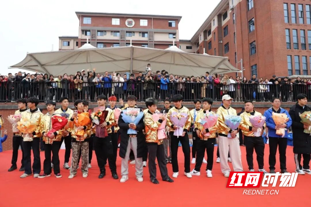 下午3时,永州队携冠军奖杯首站走进永州日升学校。校园内旌旗招展,横幅高悬,“湘超冠军校,日升欢迎您”的标语格外醒目。全校师生整齐列队,以热烈的掌声迎接心目中的偶像。球员高响动情分享夺冠历程,学子刘旺以队员身份感恩母校栽培,“冠军之队”与“育人名校”的精神在这一刻交融共鸣,激荡起澎湃的青春力量。
