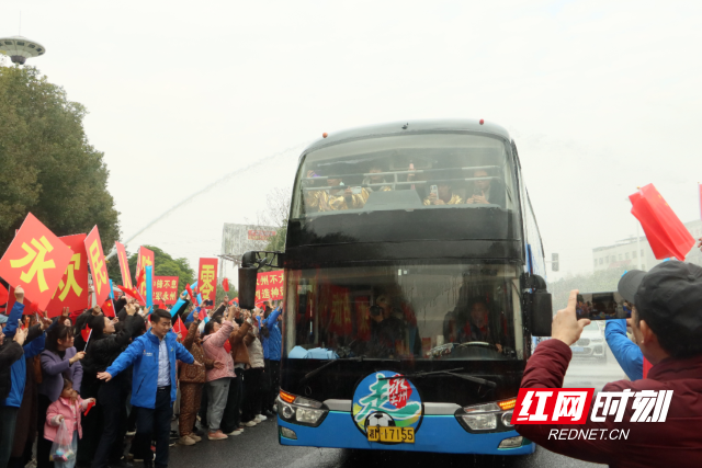 随后,冠军车队沿永州大道驶入零陵主城区。在南津北路入口,曾为球队慷慨捐赠六头牛的“牛扣哥”携牛引路,两辆消防车架起“水门”,以民航最高礼仪为英雄接风洗尘。水幕映衬“永州蓝”,沿途群众挥舞红旗、高举标语,欢呼声此起彼伏。在零陵区政府门前、零陵楼等地,市民自发穿上蓝色服装,形成一片蓝色海洋。