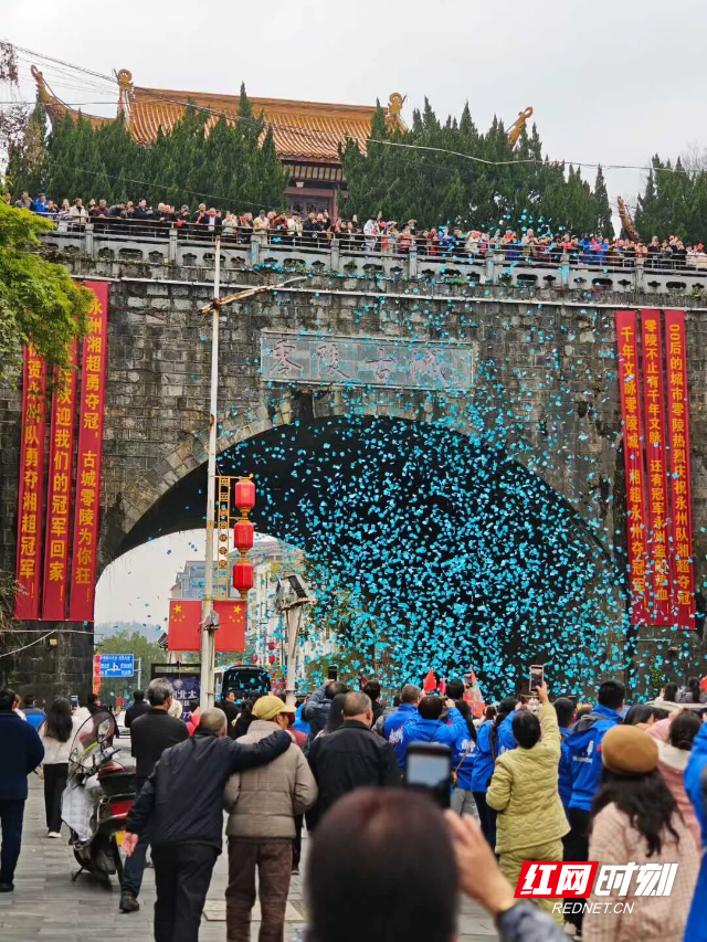零陵楼上,志愿者撒下蓝色纸花,恰似一场“蓝色细雨”,为凯旋之路铺就浪漫风景。网友纷纷点赞:“过水门接风洗尘,过城门繁花似锦——此乃零陵独有的浪漫!”活动之中,文明亦成亮色。仪式结束后,志愿者与热心球迷迅速清理现场,不留纸屑,只留喝彩,以自觉行动诠释了庆祝与文明同行、激情与秩序共存的零陵风采。