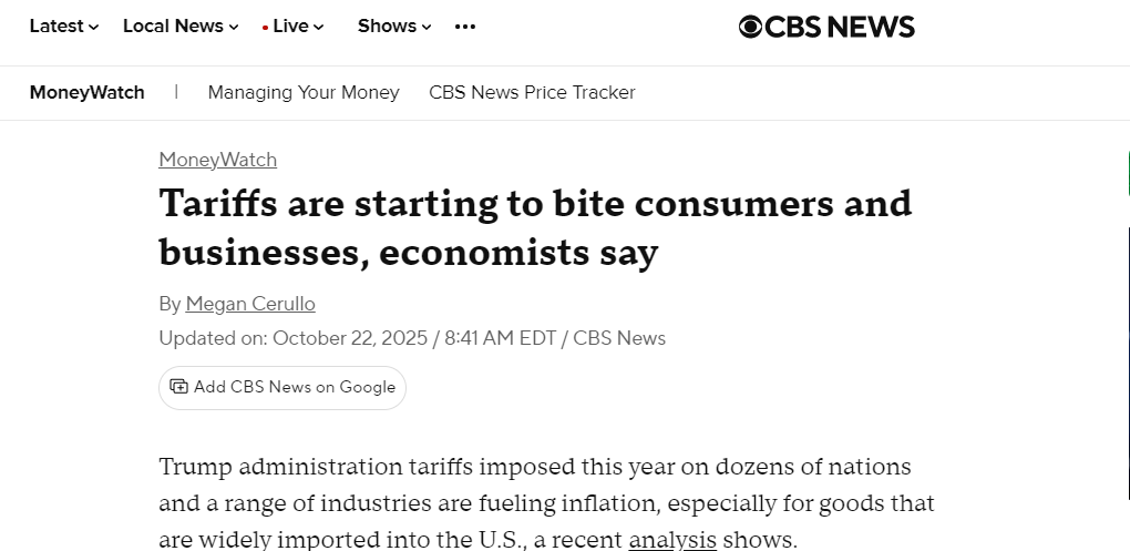 哥伦比亚广播公司(CBS)新闻网今年10月的报道也指出,美国政府实施的关税开始“咬噬”消费者和企业。经济学家指出,关税正在推高通胀,尤其是对大量进口的商品而言。进口商通常会将部分关税成本转嫁给消费者。今年关税预计将给美国企业额外增加1.2万亿美元成本,其中大部分由消费者承担。 报道说,受影响最大的商品类别包括家具、汽车零部件、电子产品和乐器。圣路易斯联储研究显示,关税已对消费者价格产生“可衡量的向上压力”。该机构经济学家马克斯·德沃金表示,即使未来不再增加关税,价格变动仍将在未来几个月继续演变并影响消费者。